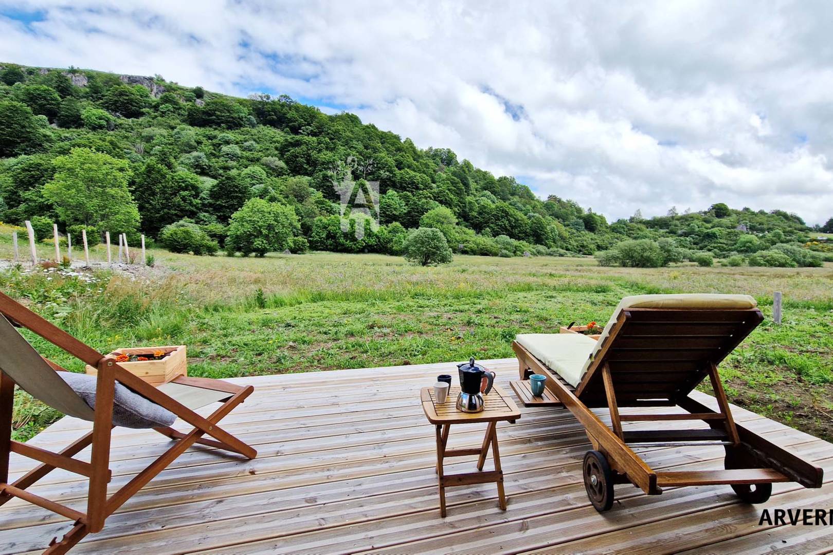 Une porte-fenêtre du côté de la salle à manger donne accès à une terrasse, parfaite pour les repas en plein air, tandis qu’une autre ouverture du côté du salon mène à un espace extérieur convivial où vous pourrez vous détendre en profitant de la vue.