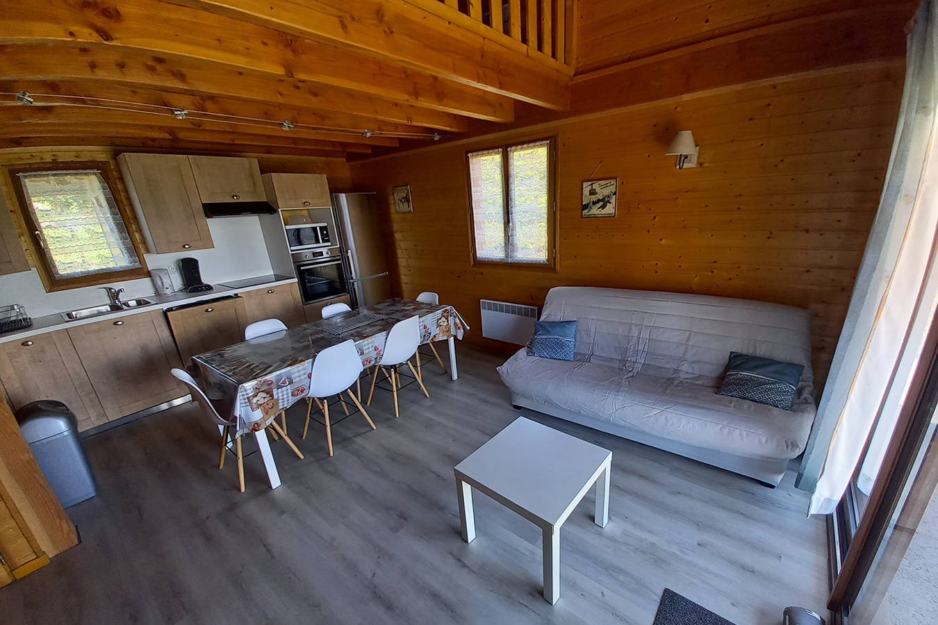 Comprenant une cuisine équipéee, 2 chambres de 2 personnes avec lit de 140 cm, une grande mezzanine, avec 2 lits de 90 cm, une grande salle de bain et un salon avec un clic-clac.