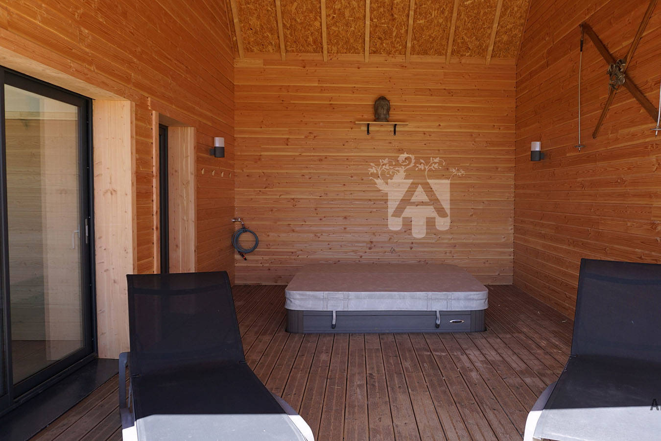 A l’extérieur, la terrasse offre un espace couvert (avec le Jacuzzi 6 places) et un espace découvert (mitoyen avec un autre gîte pour 4 personnes) avec salon de jardin, parasol et barbecue.