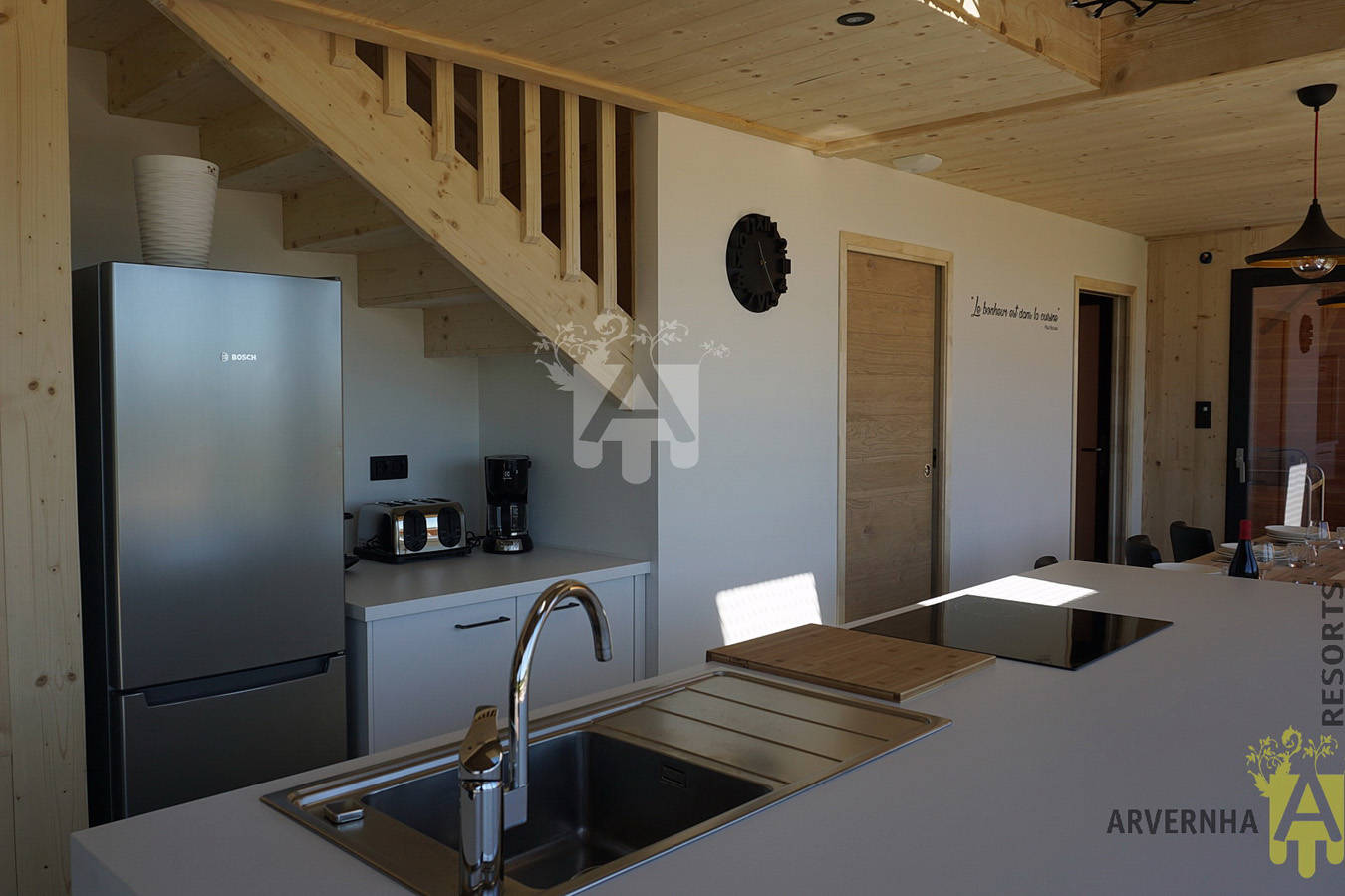 Belle construction en bois pour 6 personnes, à proximité de Besse et Saint-Anastaise, ce chalet neuf de 130 m² sur 2 niveaux avec terrasse dispose de prestations de qualité tel qu’un Sauna et un Jacuzzi.Au rez-de-chaussée, vous serez immédiatement enchantés par le séjour spacieux et lumineux, ouvrant sur la terrasse par de grandes baies vitrées. Sa cuisine ouverte est très bien équipée et invite à de bons moments de convivialité autour de son îlot central. Si vous préférez la chaleur du poêle, vous pourrez également vous affaler dans l’énorme Pouf du salon. Mais bien entendu, pour un maximum de détente, c’est bien le Sauna et le Jacuzzi (sur la terrasse couverte) qui vous raviront par-dessus tout ! A ce niveau, vous disposerez d’un WC avec lave-linge et sèche-linge, d’une chambre parentale avec 1 lit double (160 cm), d’une salle d’eau avec douche à l’italienne / WC.