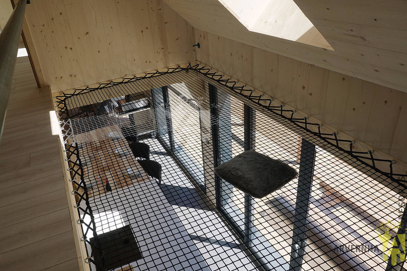 Au deuxième étage se trouve les 2 autres chambres : la chambre n°2 avec ses 2 lits simples (90 cm), et la chambre n°3 avec son 1 lit double (160 cm), d’un WC séparé, d’une salle de bain avec baignoire et vasque, et de filets tendus sur la mezzanine.
