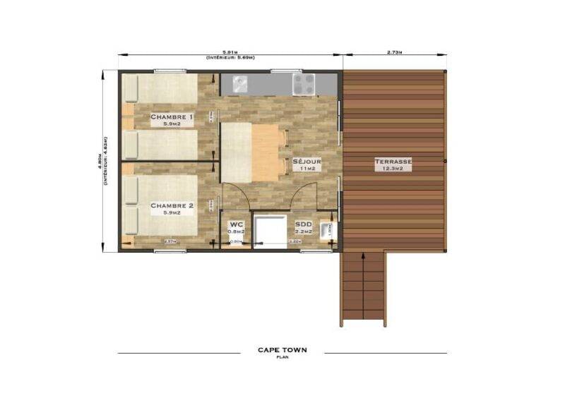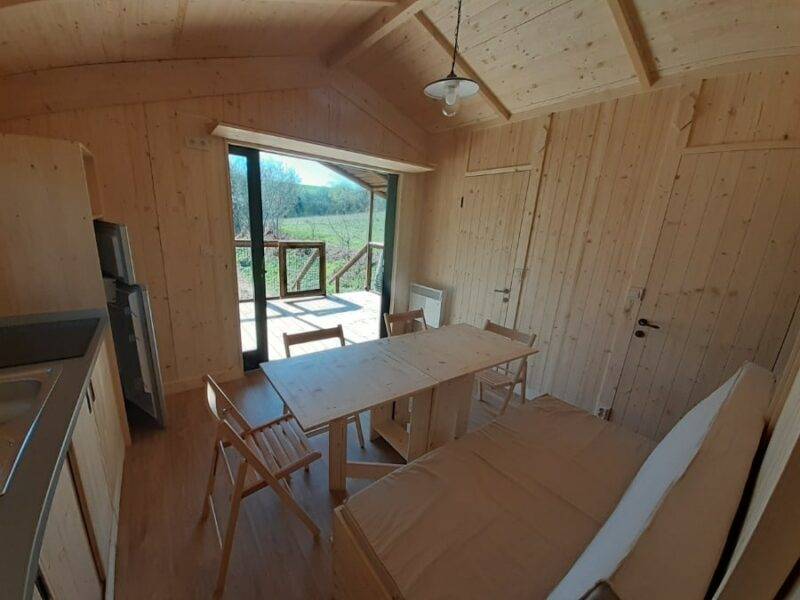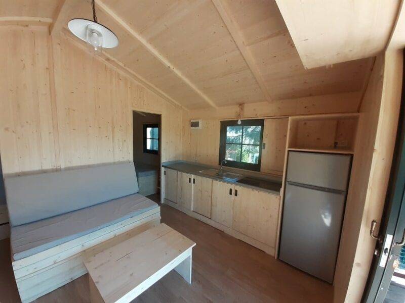 Le chalet sur pilotis 2 chambres mesure 27 m². Entièrement équipé (avec canapé convertible), il possède une terrasse de 13 m². Idéal pour les groupes de 5 à 7 personnes.