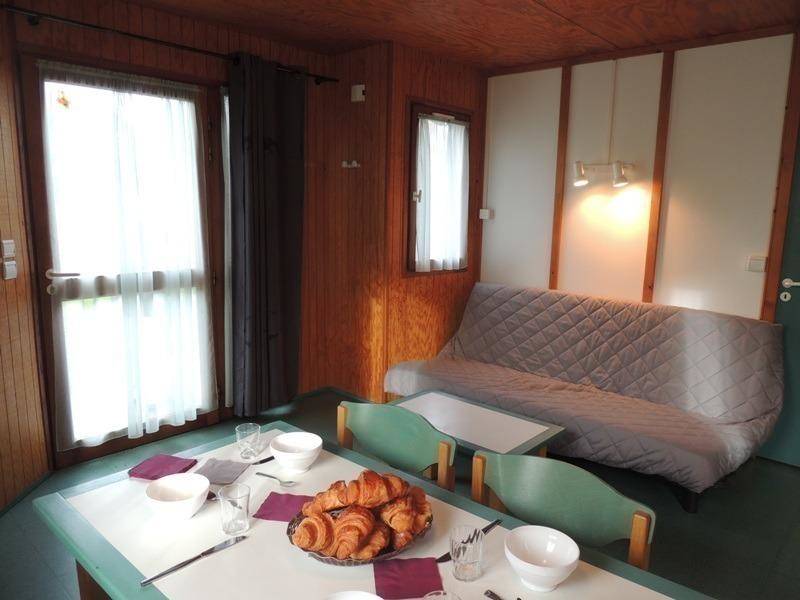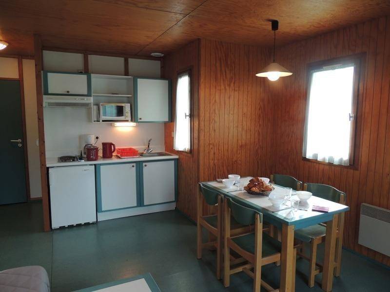 Chalets au rez-de-chaussée (38 m²), séjour, coin cuisine, 2 chambres (3 lits), salle d’eau, wc, buanderie commune, draps à la location, terrasse privée, terrain attenant non fermé commun. Loisirs sur place : ping-pong, tennis (couverts et découverts), piscine…