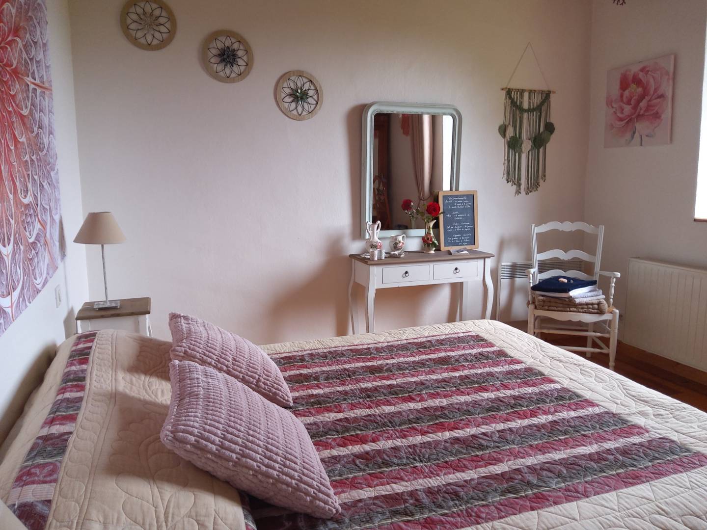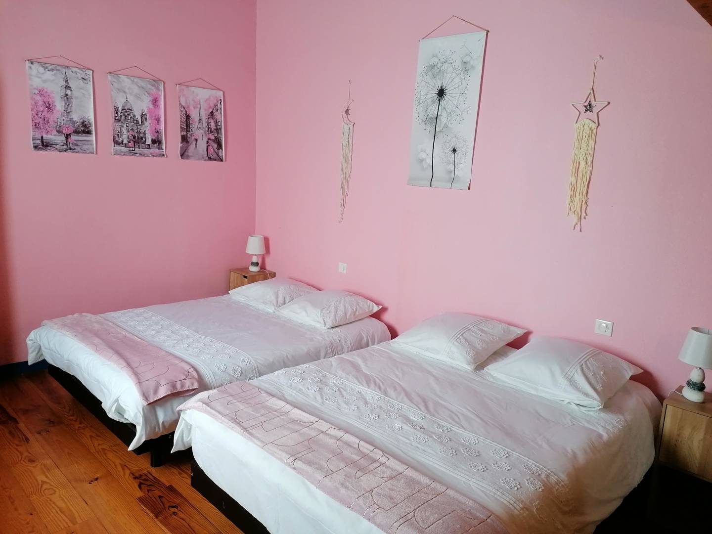 Vous disposerez d’une grande chambre avec un lit de 160 cm. Une seconde chambre avec 2 lits de 140 cm. Nous mettons à votre disposition un espace salon TV équipé de fauteuils relaxants et vous offrons café, thé, tisane.