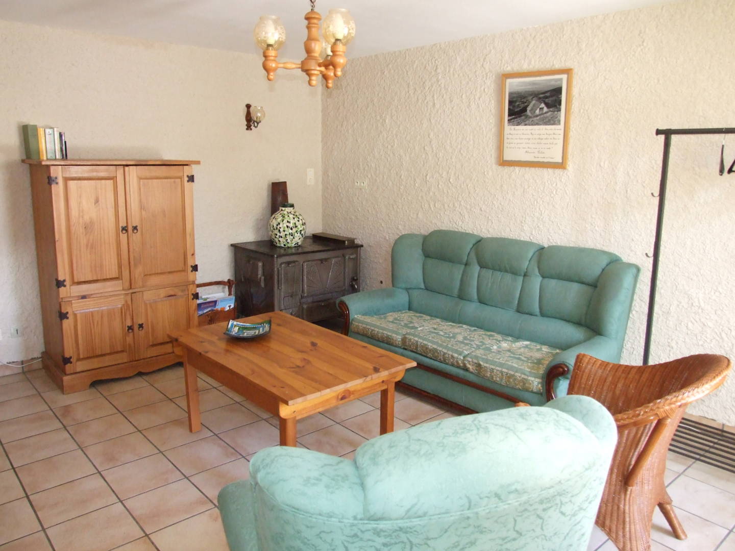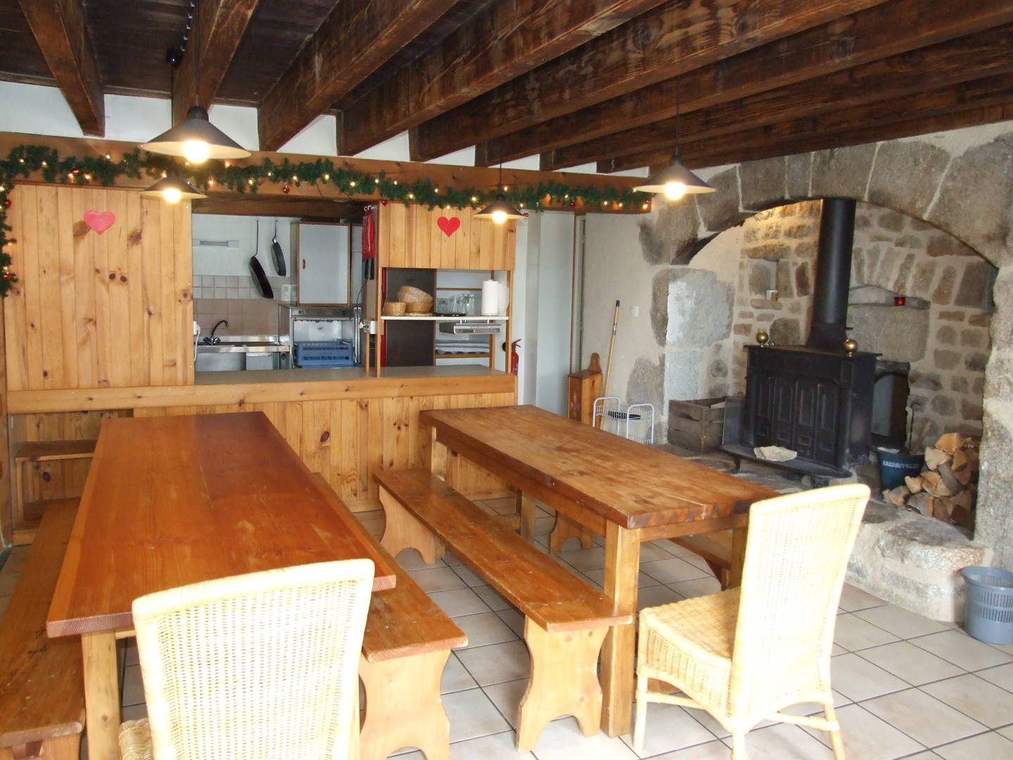 À côté du salon se trouve la cuisine avec la salle à manger. La cuisine est ouverte sur la grande salle à manger contenant une cheminée avec un poêle à bois. Le petit déjeuner est servi le matin dans la salle à manger. Un réfrigérateur est disponible dans la buanderie pour tous nos hôtes afin de garder au frais les objets qui doivent être conservés. Plusieurs fois par semaine, il est possible de nous rejoindre pour un repas convivial avec nos autres hôtes.