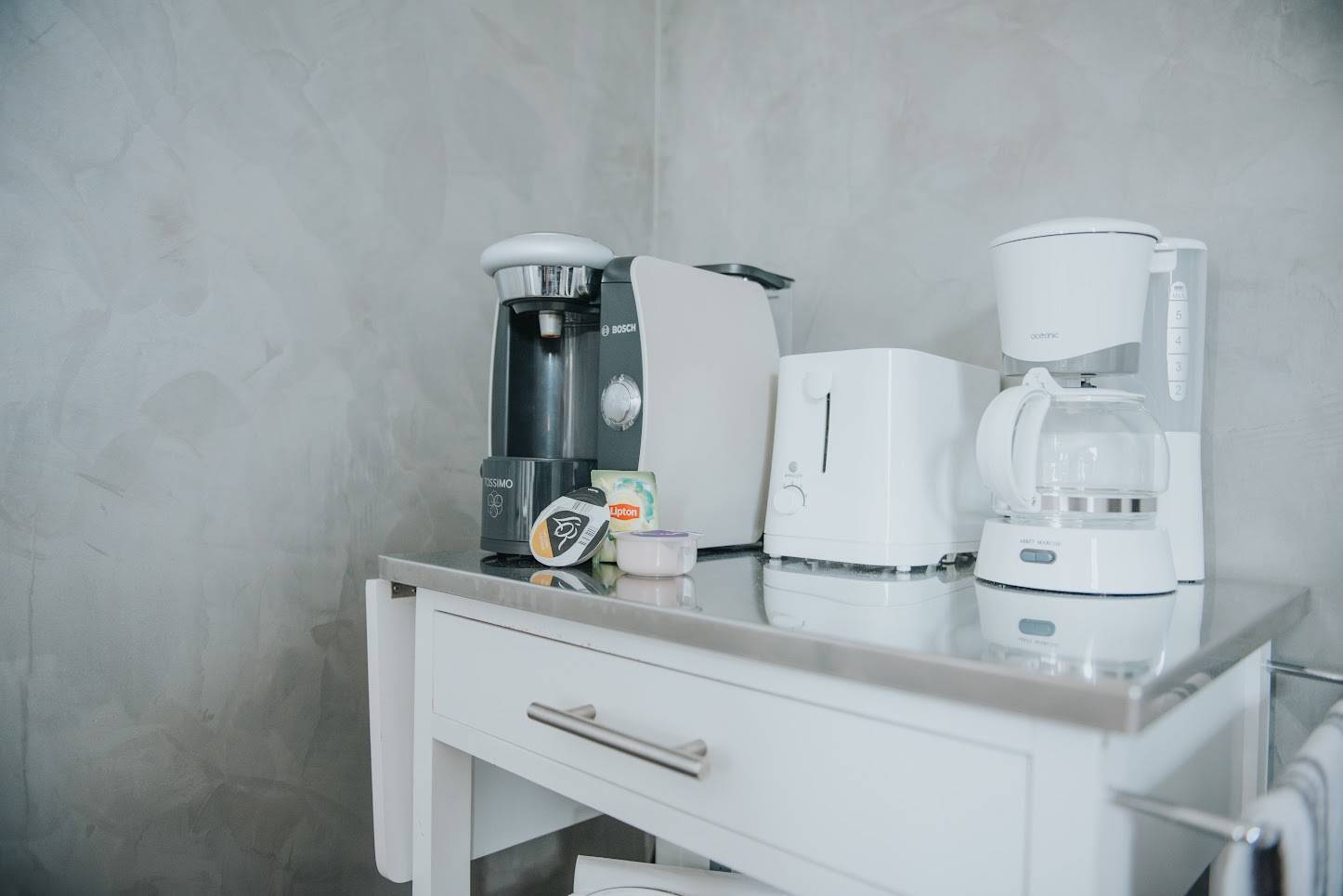 – ¨Petit réfrigérateur, micro-onde, cafetières, bouilloire, grille pains, vaisselle