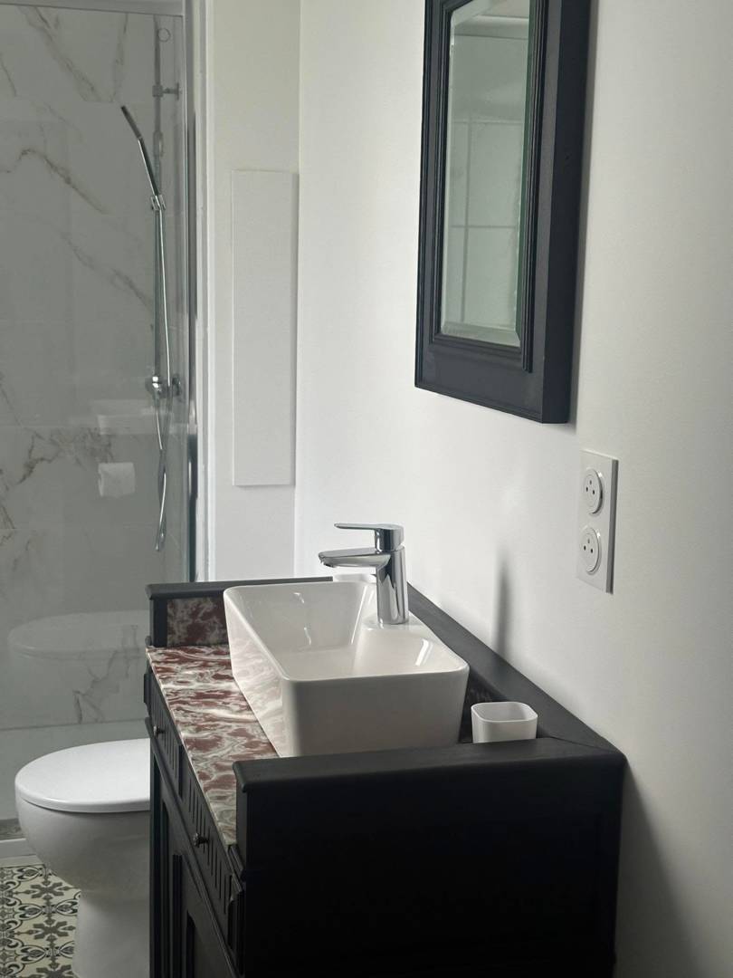 La chambre style 1900, pouvant accueillir 2 voyageurs, composée d’une lit double, de sa salle de douche attenante avec grande douche 120cm, vasque et wc.
