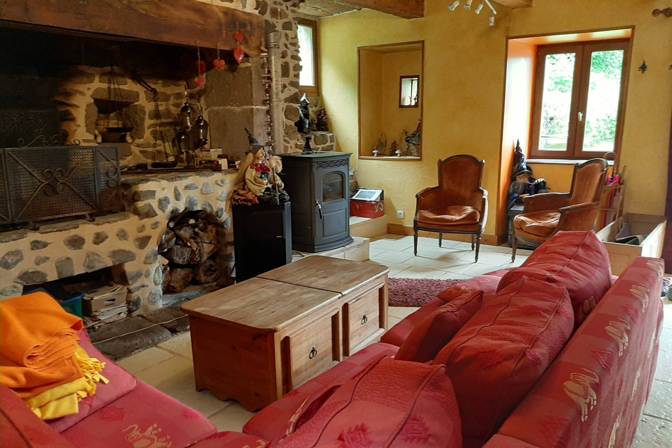 – Un grand séjour de 60m2 comprenant un coin salon avec cheminée (une niche de bois offerte), une cuisine à l’américaine tout équipée, un espace salle à manger.