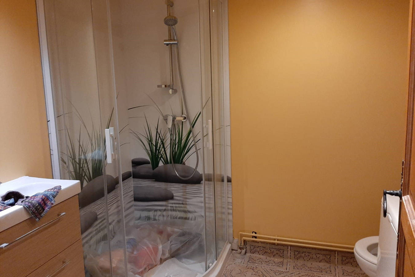 – Une salle de bain avec douche, WC, lave-linge et sèche-linge