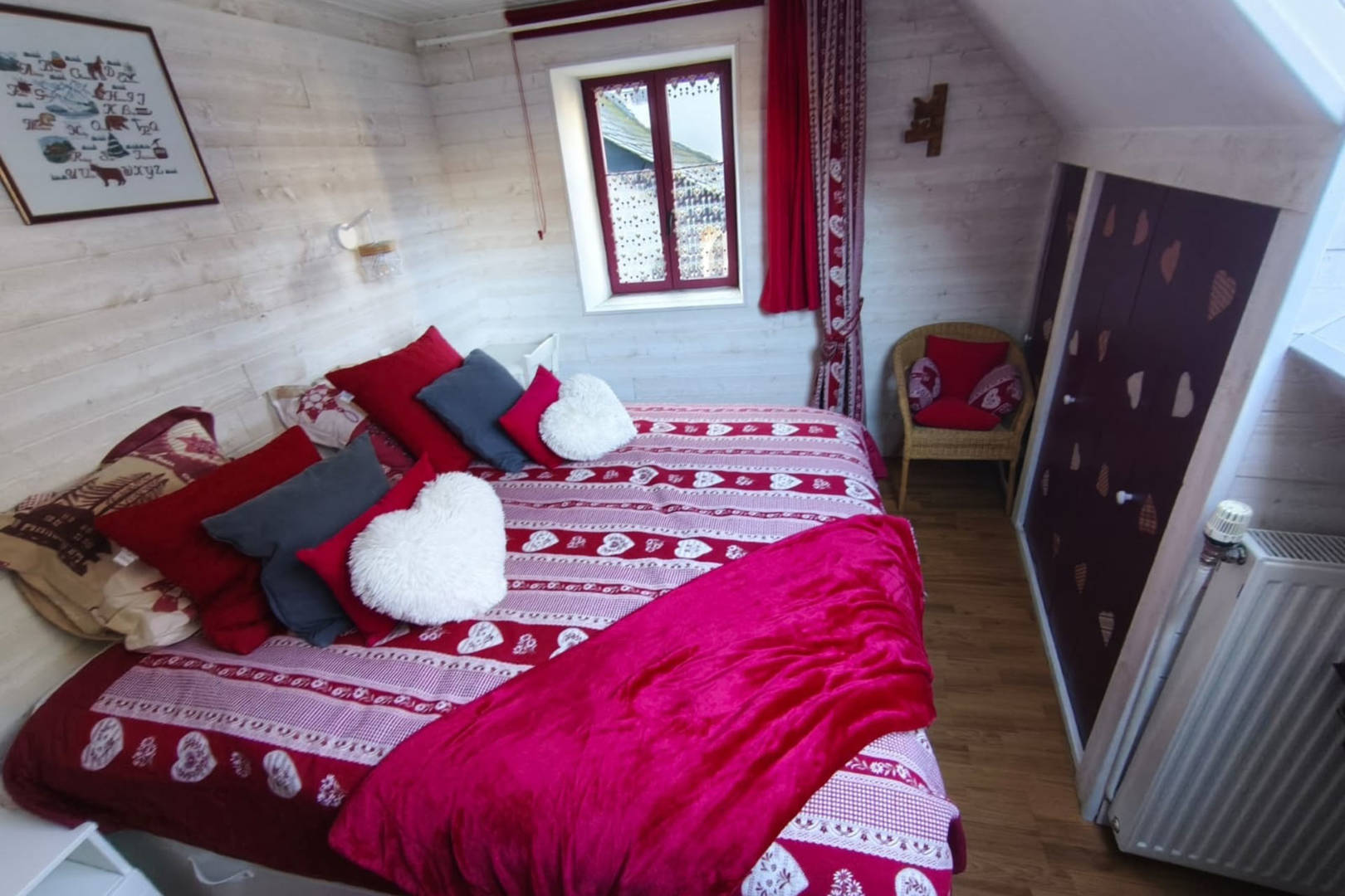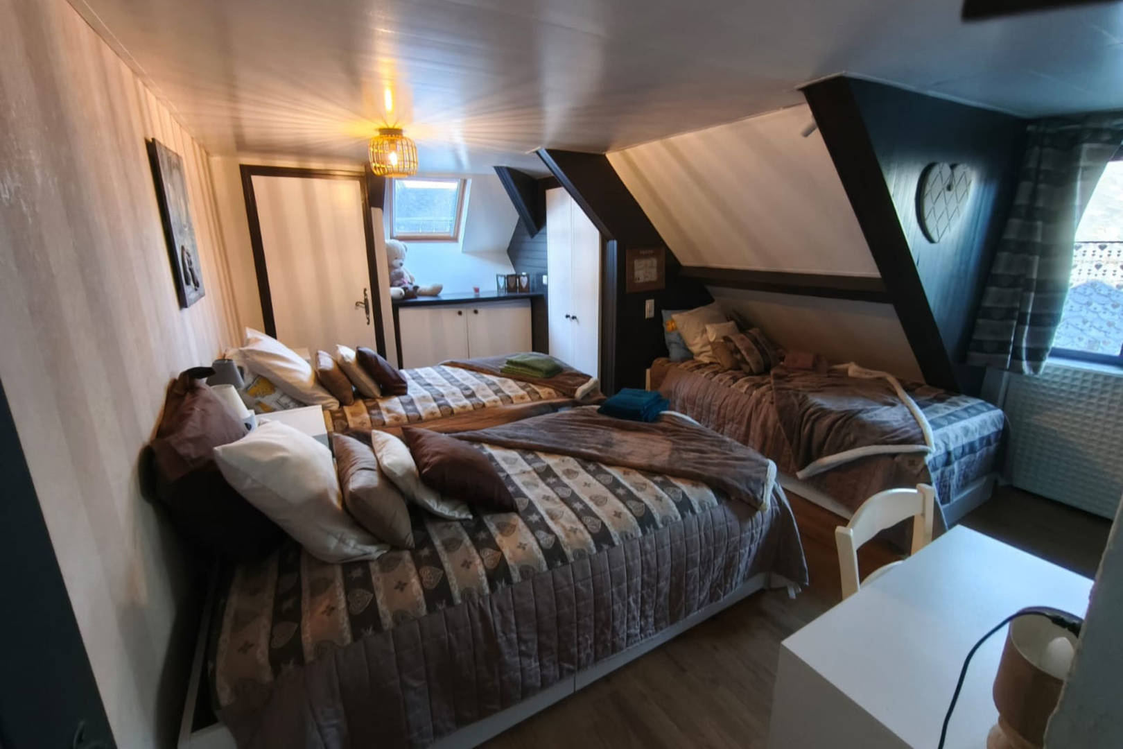 Au 2ème étage, le charme mansardé prolonge l’ambiance feutrée du lieu. Une première chambre propose un couchage King Size et une seconde chambre permet d’accueillir jusqu’ 3 enfants couchages simples, également une salle de bain fonctionnelle avec double vasque, douche et WC.