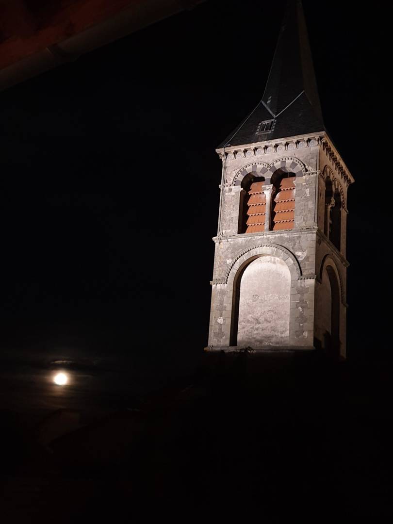 Il est accolé à une petite église romane, qui n’est plus guère utilisée et dont les cloches ne sonnent qu’en journée.