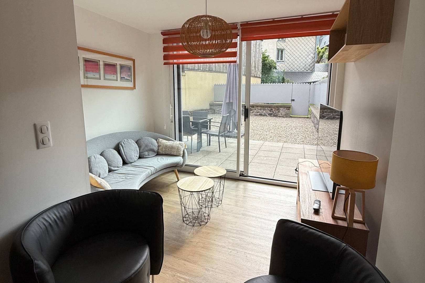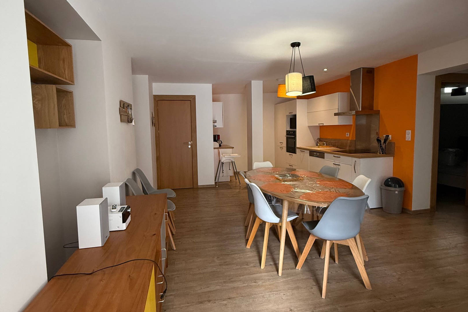 Cuisine ouverte équipée, séjour avec table à manger pour 6personnes, et petit coin salon donnant sur terrasse et cour privée.
