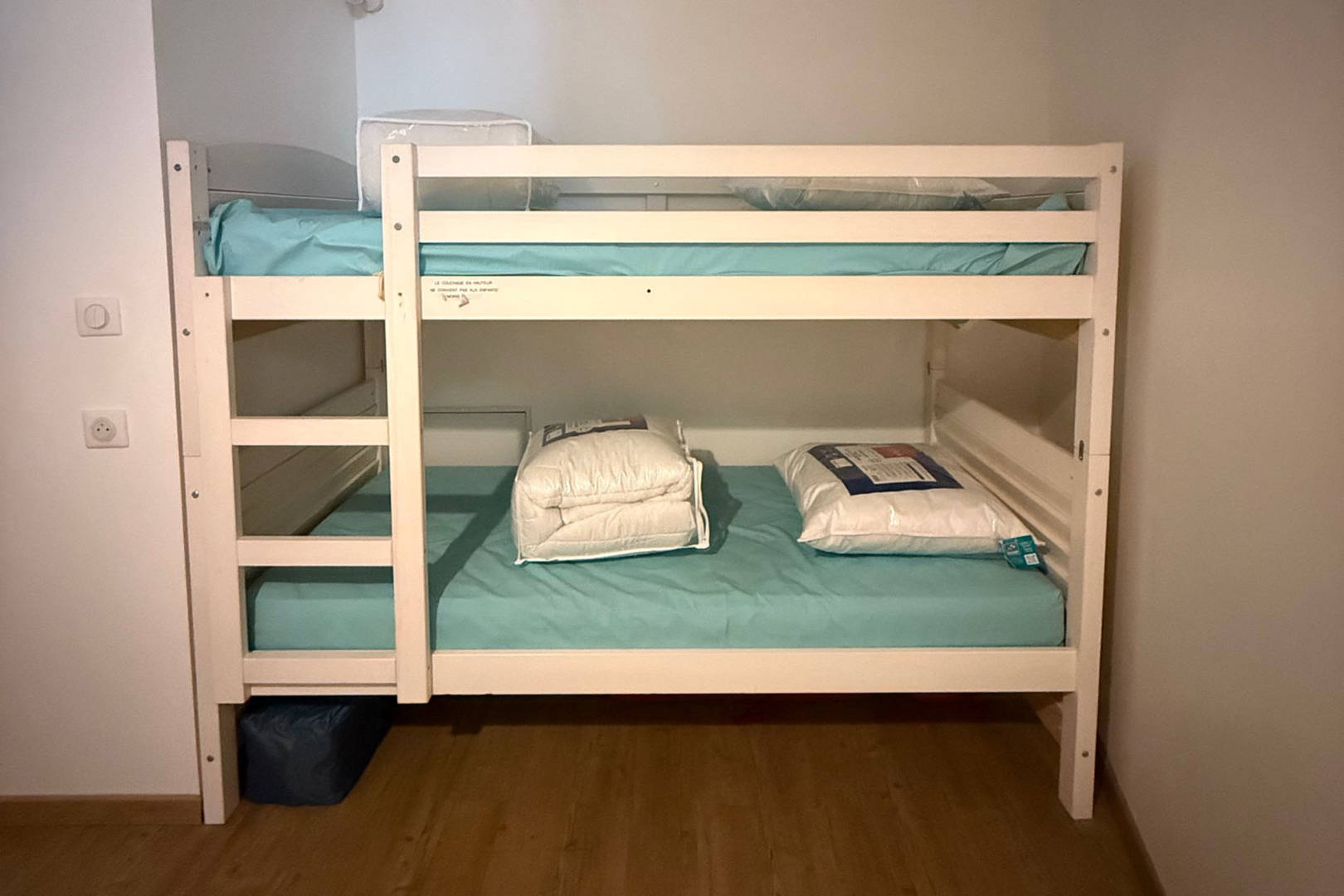 Chambre 3 : lit 160 et lits superposés 90, celui du haut est strictement interdit aux enfants de moins de 6ans. Attention, petite fenêtre dans cette chambre : SOUPIRAIL.