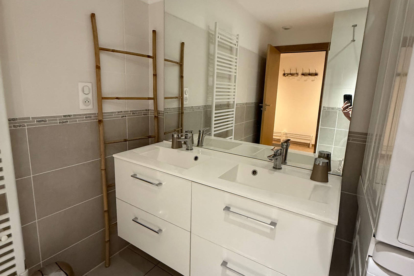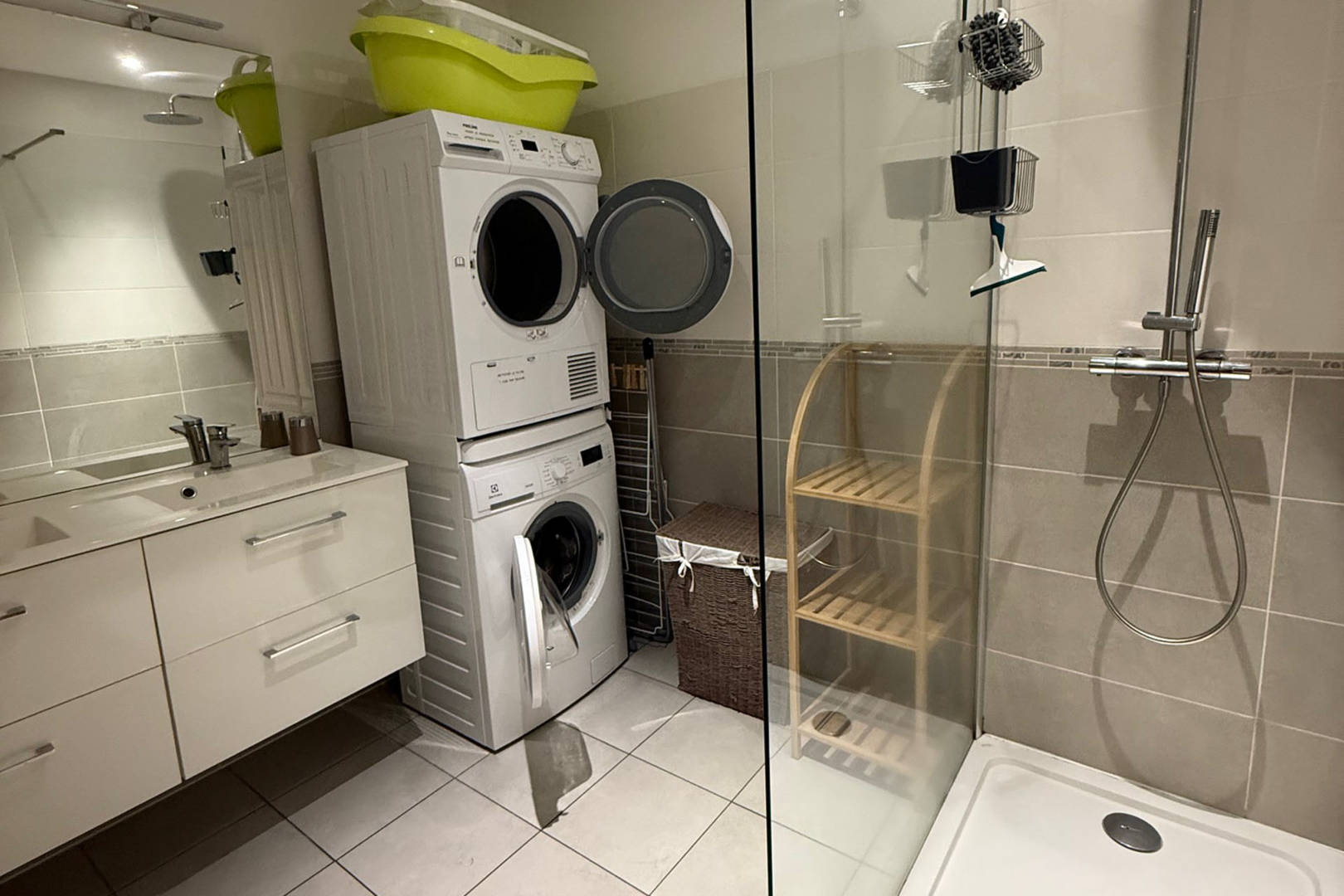 Une grande salle de bain avec douche, double vasque, machine à laver et sèche linge. WC.