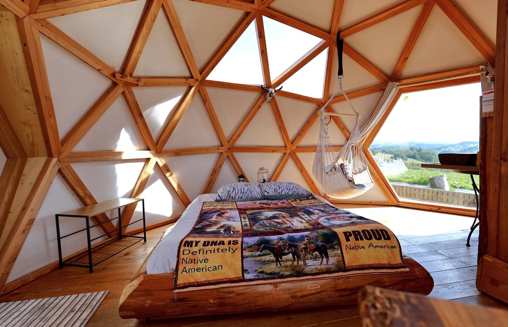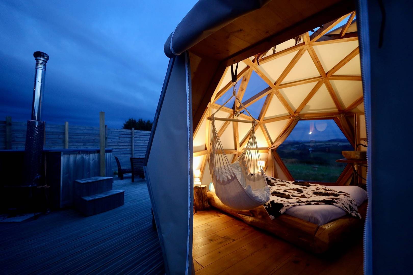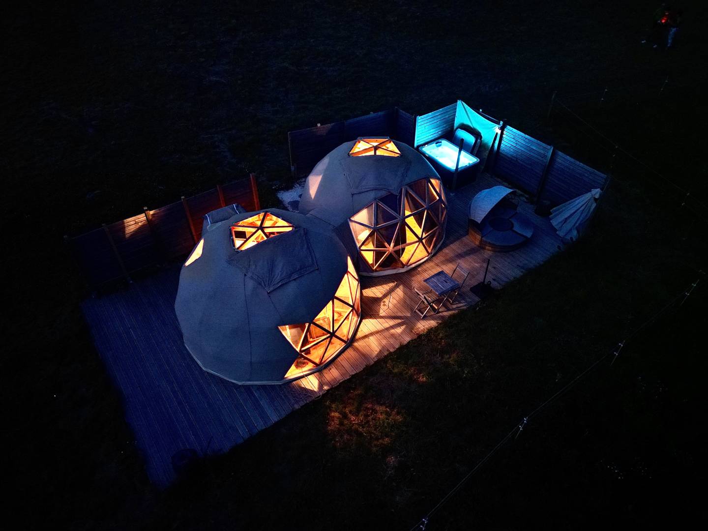 – La Suite Étoilée est un wigwam de 28 m², équipé d’un lit rond avec une salle d’eau, WC, spa privatif avec une ambiance bohème. Attenant un dôdome pour les enfants. Spa sur la terrasse