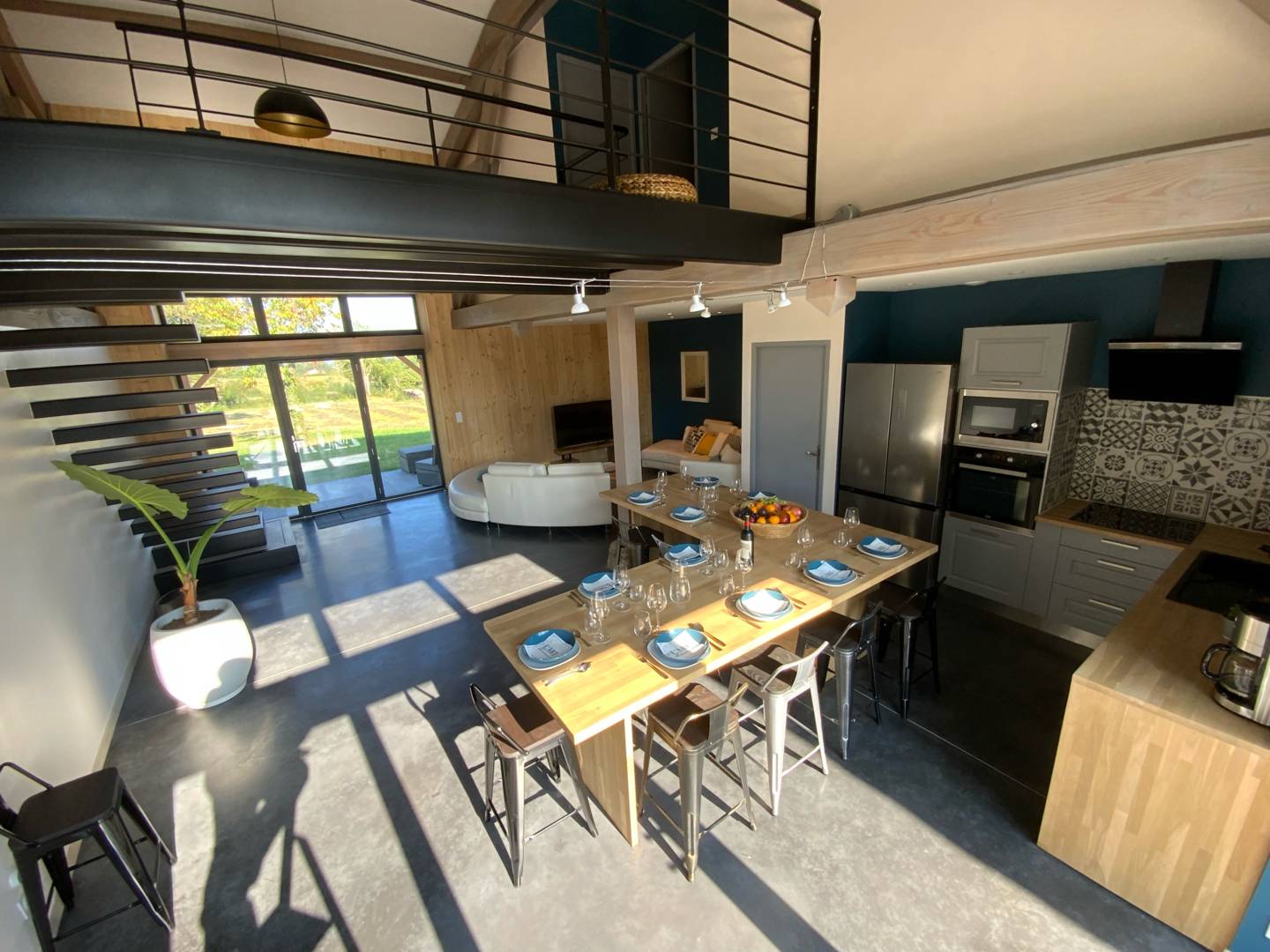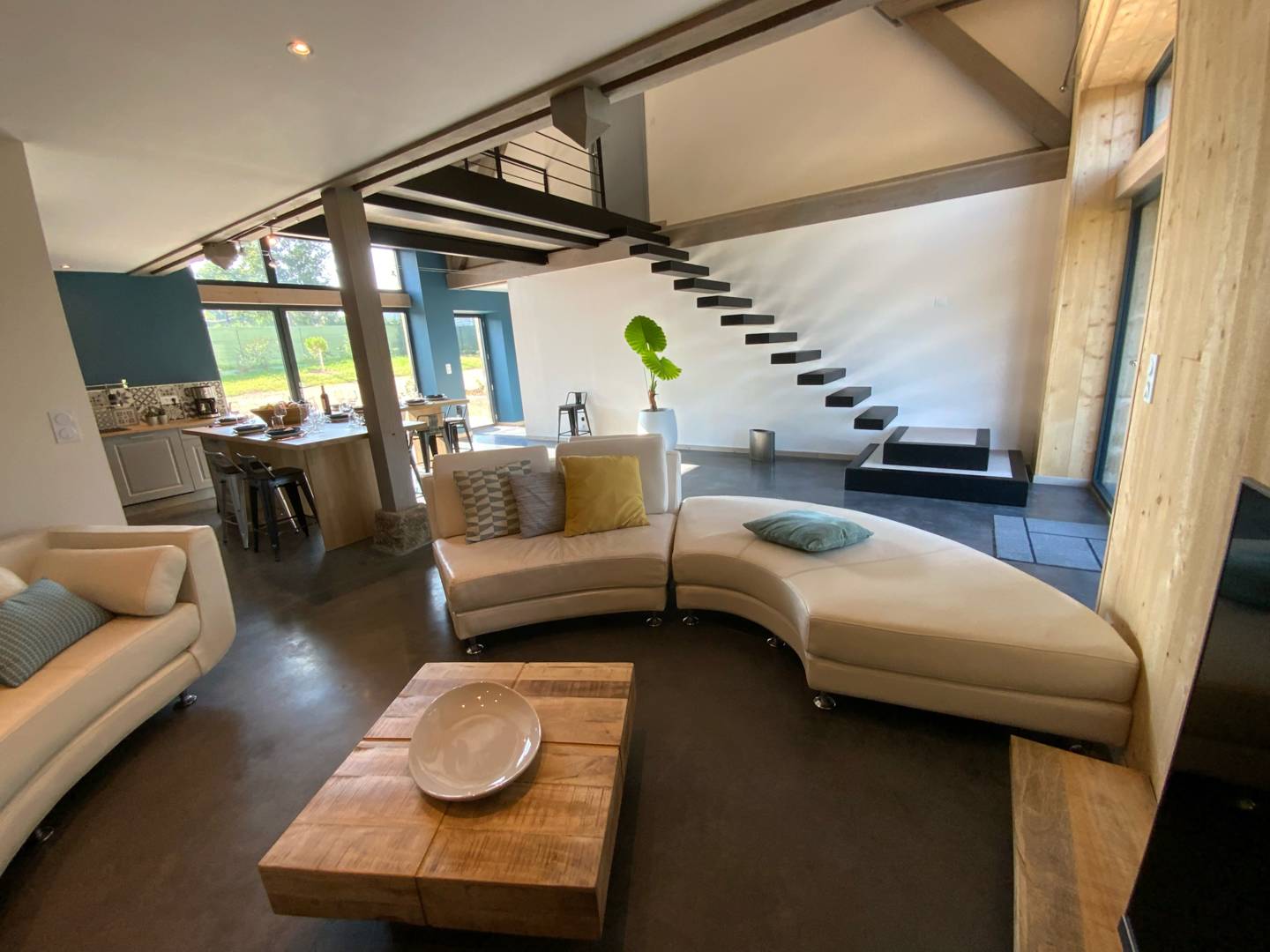 Vous profiterez des extérieurs pour vous détendre avant d’entrer dans un style plus industriel marqué par sa pièce maîtresse : l’escalier.
