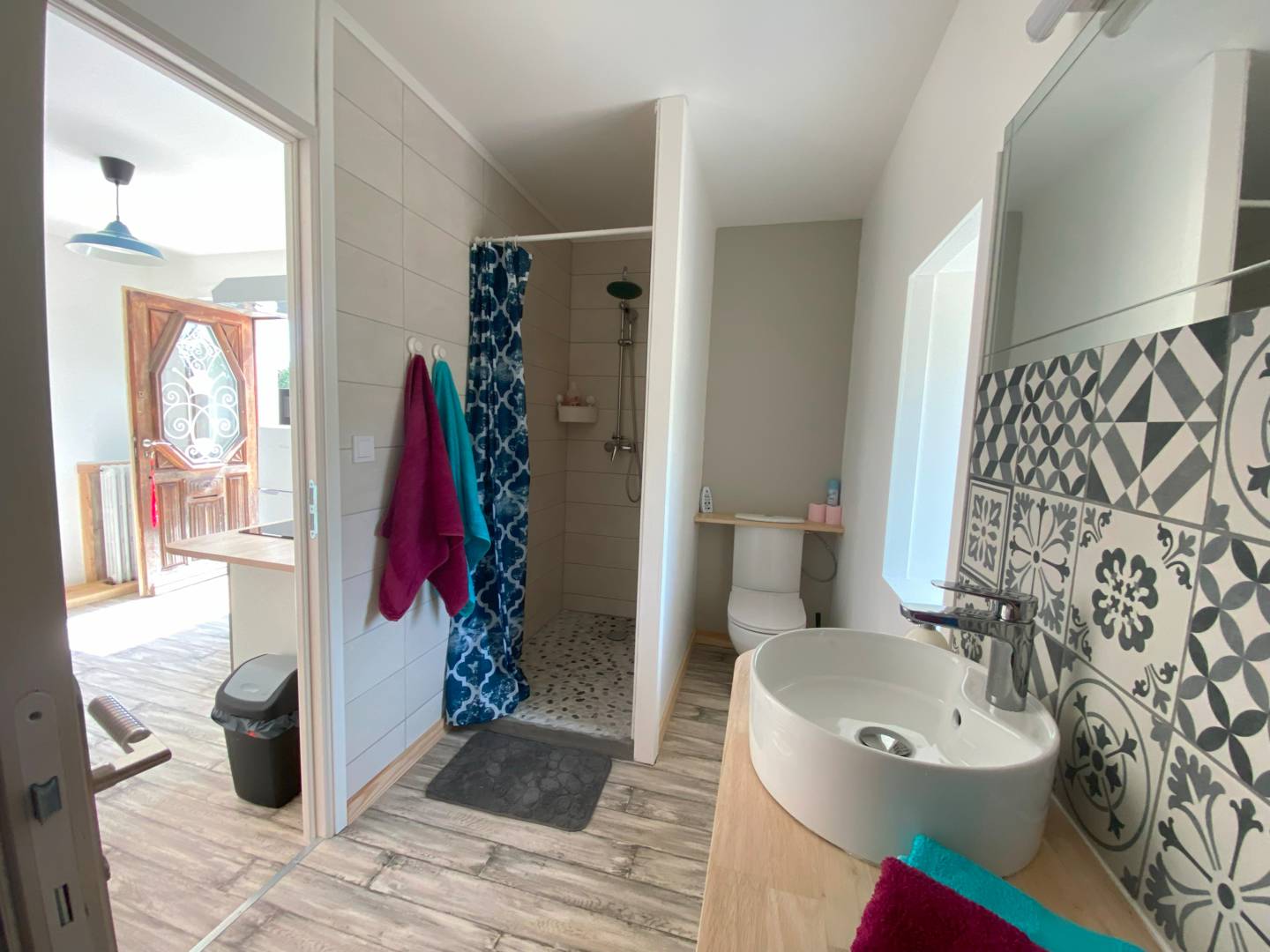 À proximité immédiate, la salle de douche et le toilette se dévoilent, offrant suffisamment d’espace pour se sentir à l’aise. Des linges de toilette y sont soigneusement déposés : une grande serviette et une petite, chacun arborant sa propre couleur, ajoutant une touche personnelle à cette ambiance tranquille.