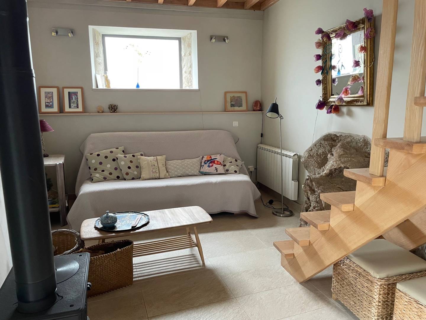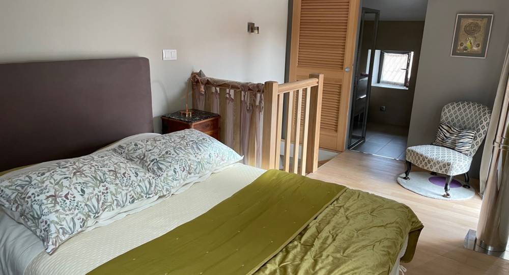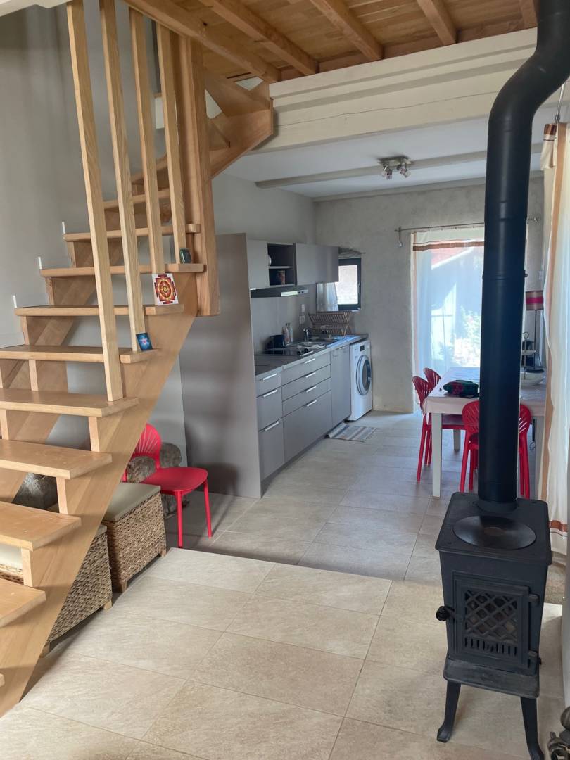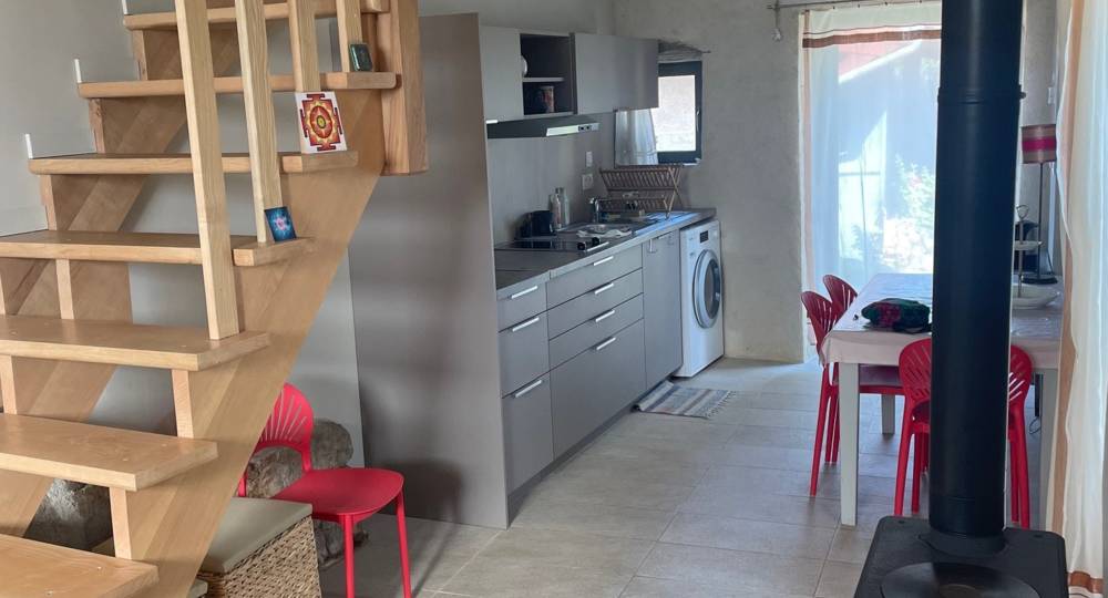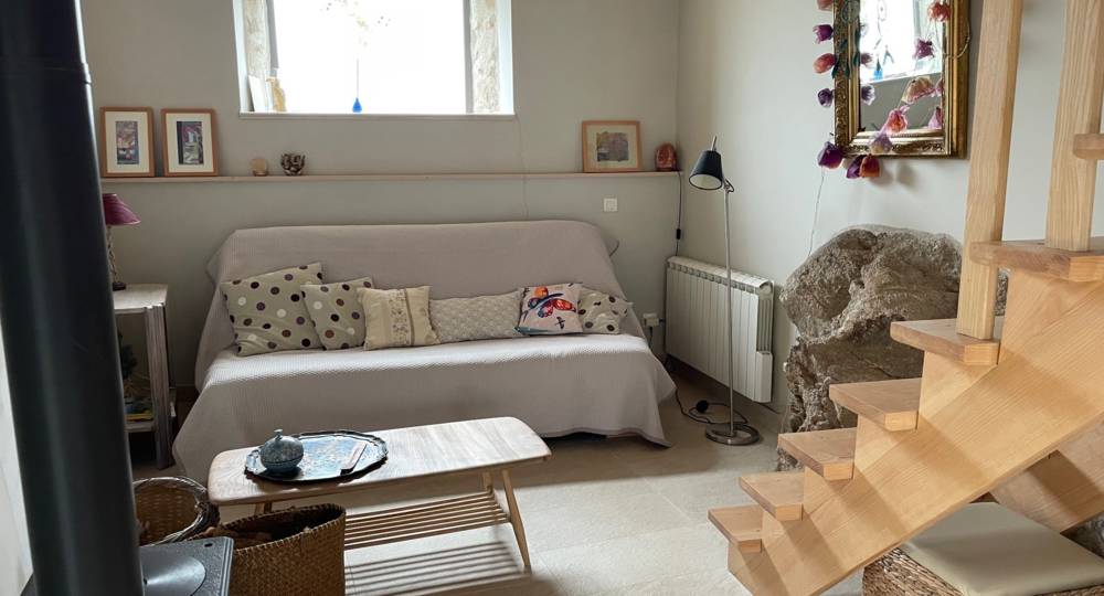La rénovation de la maisonnette a été effectuée à l’aide de produits naturels et écologiques. La restauration des murs intérieurs/extérieurs a été réalisée à la chaux, isolation en chanvre et laine de bois et parquet huilé. Les ouvertures sont d’origine. Le gîte a un très bel escalier en bois qui s’adapte au rocher.