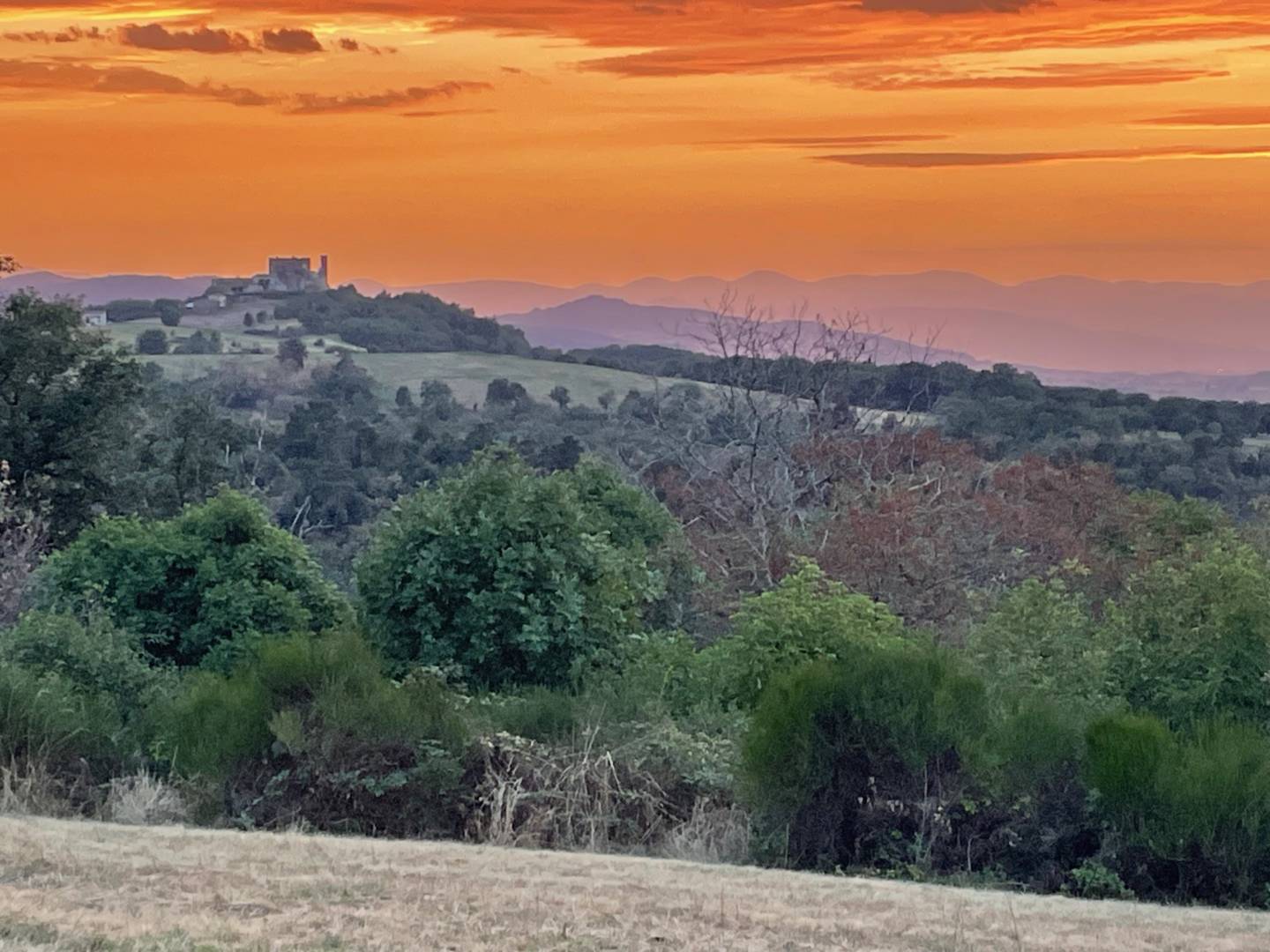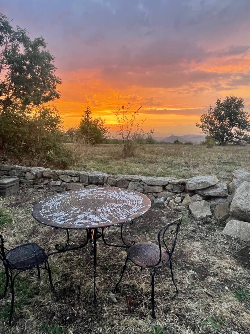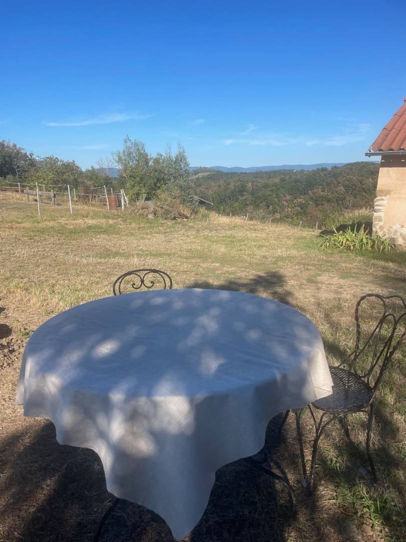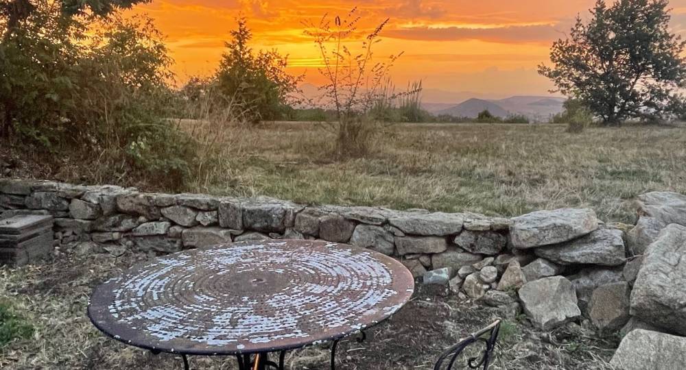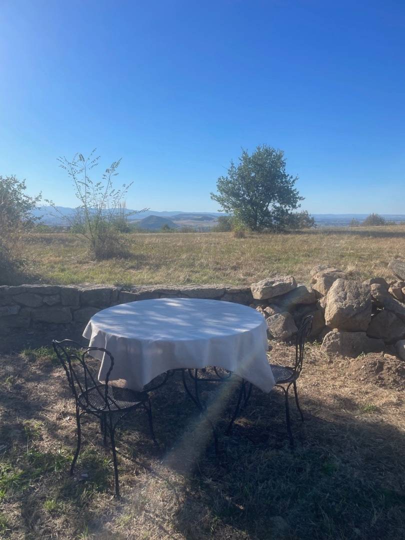 Le coin repas extérieur a une exposition ouest et est pour profiter du soleil et de la vue de la ‘ »petite Toscane d’Auvergne ».