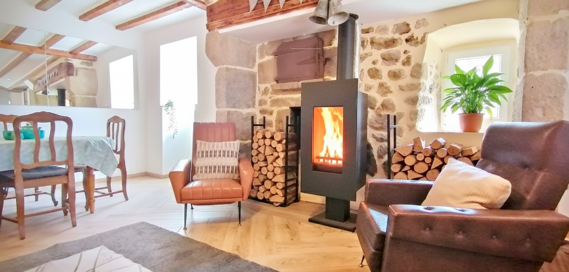 Le rez-de-chaussée s’ouvre sur un bel espace décloisonné, où un mur en pierre donne du cachet à l’ensemble. La pièce combine cuisine moderne, coin salon et salle à manger. Le salon, niché autour d’une grande cheminée en pierre avec un poêle à bois contemporain, comprend deux fauteuils et un canapé deux places, parfaits pour se détendre après une journée de découverte. Une table à manger pour quatre personnes et un buffet pour la vaisselle complètent l’espace.