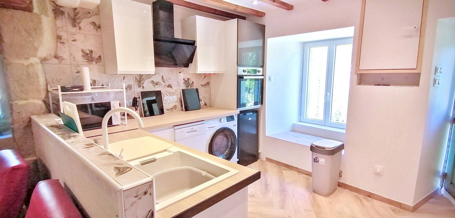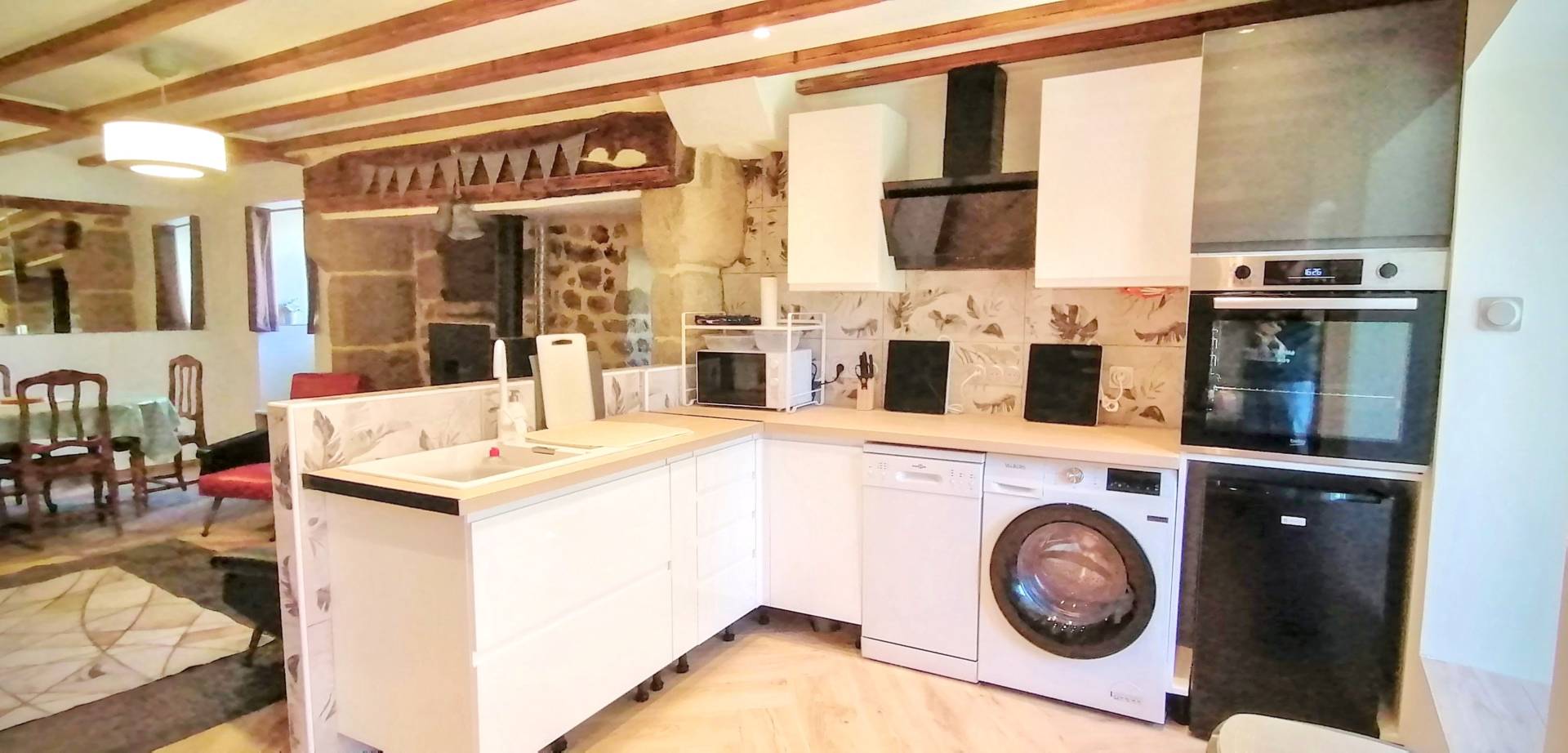 La cuisine, entièrement équipée, répond à tous les besoins culinaires : plaques vitrocéramiques, four, four à micro-ondes, lave-vaisselle, lave-linge séchant, bouilloire, machine à café, réfrigérateur-congélateur, ainsi qu’un large choix d’ustensiles, casseroles et poêles. Que ce soit pour préparer un repas simple ou un festin familial, tout est à portée de main.