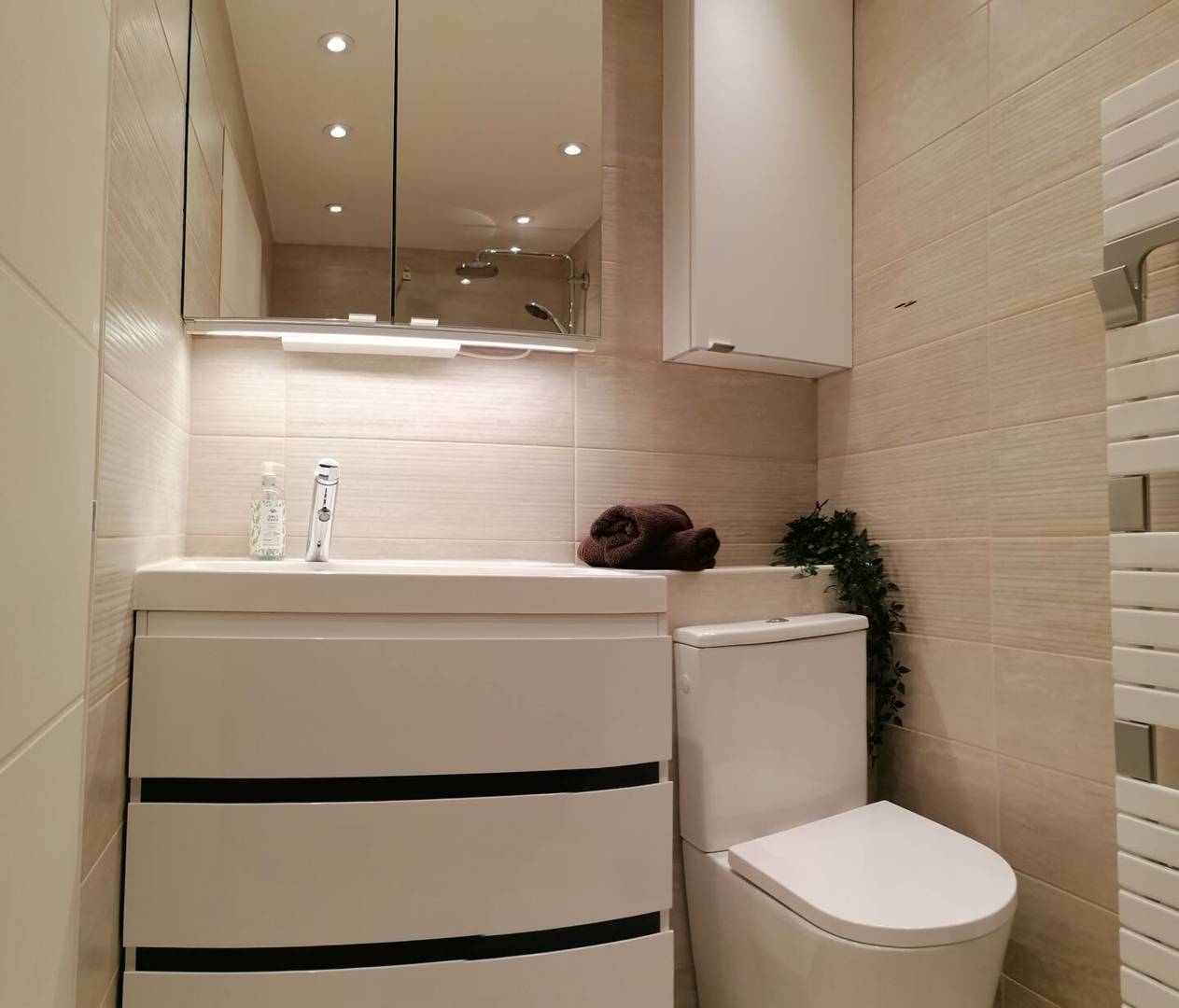 La salle de bain à l’étage est équipée d’une douche à l’italienne spacieuse, d’un meuble vasque contemporain de 80 cm avec miroir et rangements intégrés, ainsi que d’un WC moderne situé dans la même pièce.