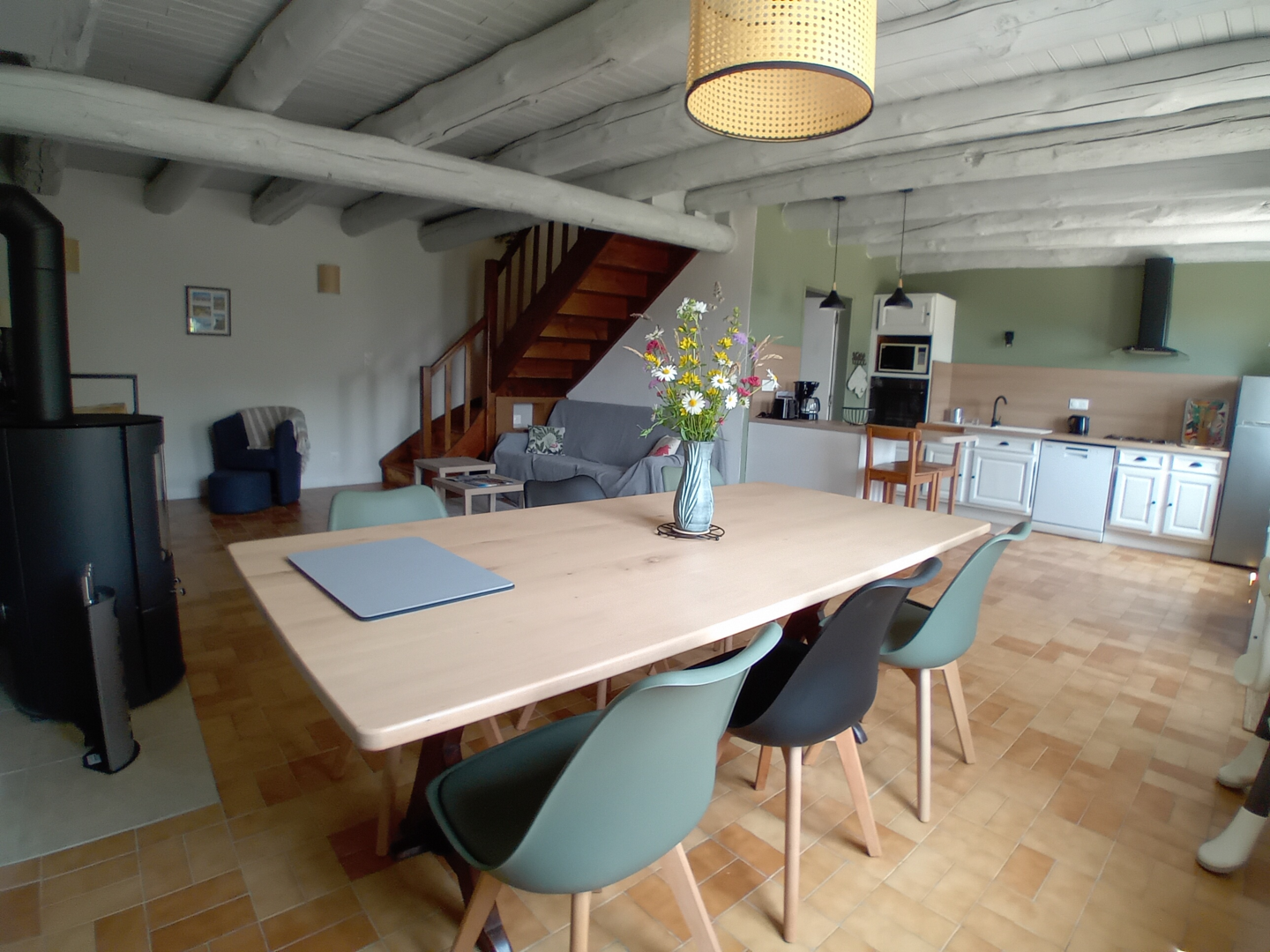 Au rez-de-chaussée, un séjour cuisine ouverte toute équipée avec poêle à bois. Une buanderie, Un WC indépendant.
