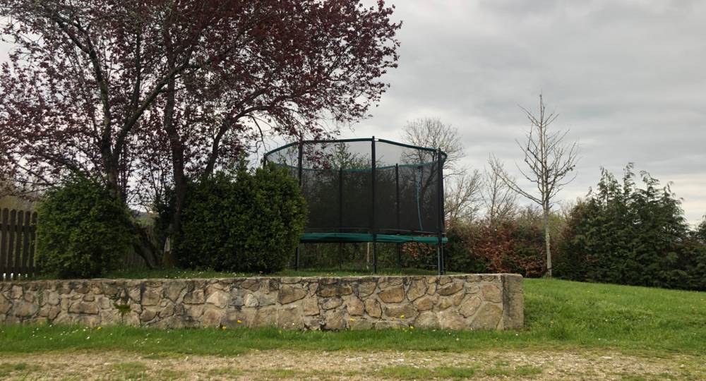 -> terrain non clos, mais aménagé, avec espace enfants partagé (trampoline, balançoire) Aménagement pour enfants (partagé) : trampoline, balançoire, etc.