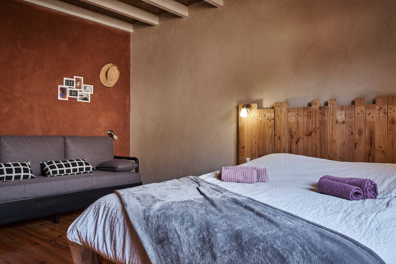 -> Chambre Ouest : Couchage double (140×190) + canapé-lit qualité hôtelière (TEDIBER, 140×190) Capacité de 1 à 4 personnes selon les besoins