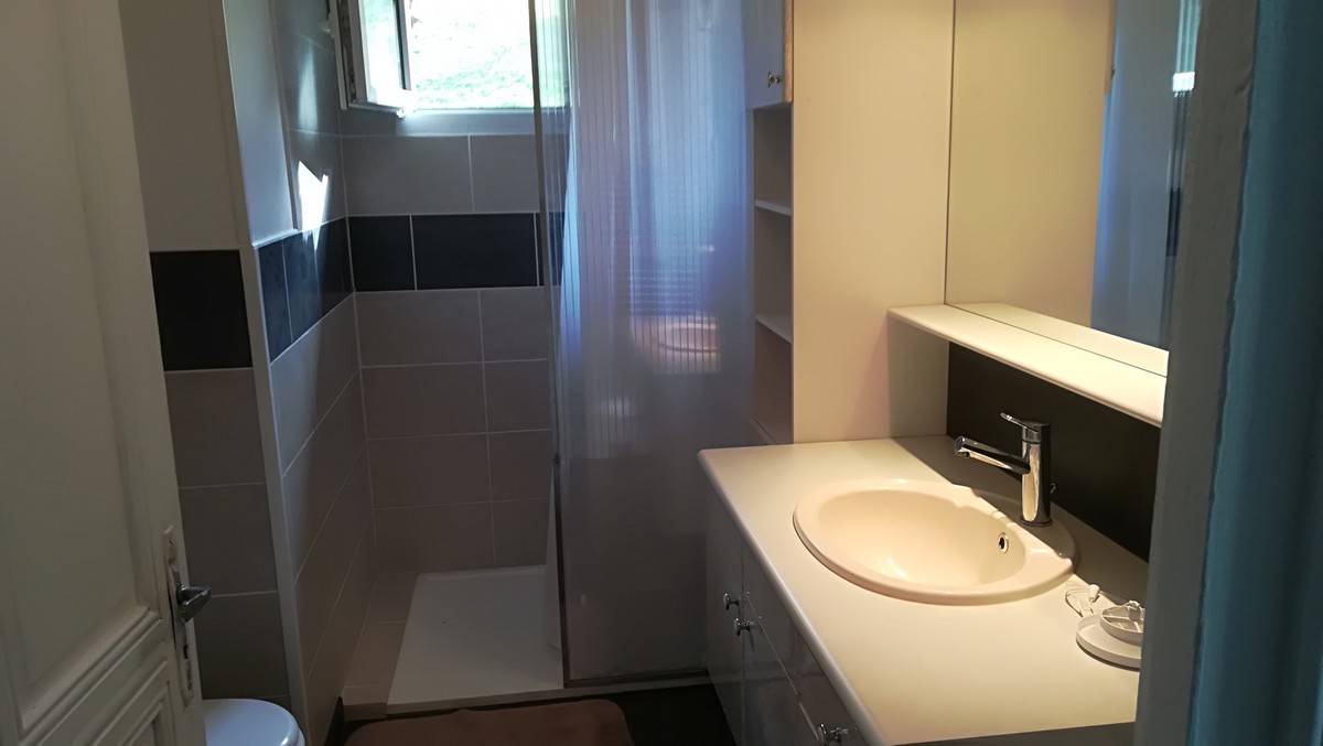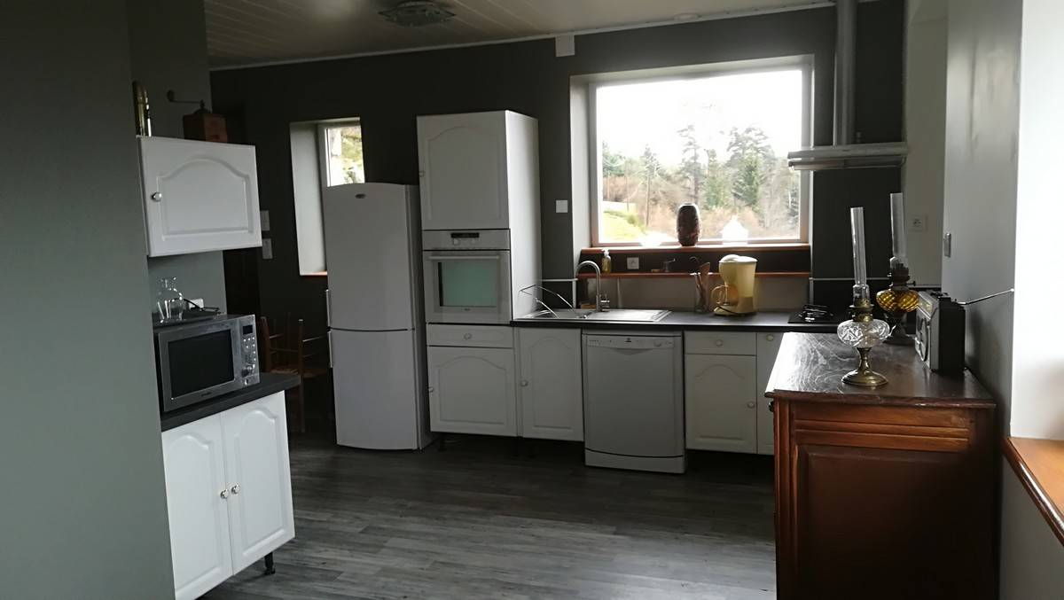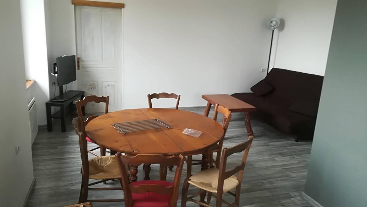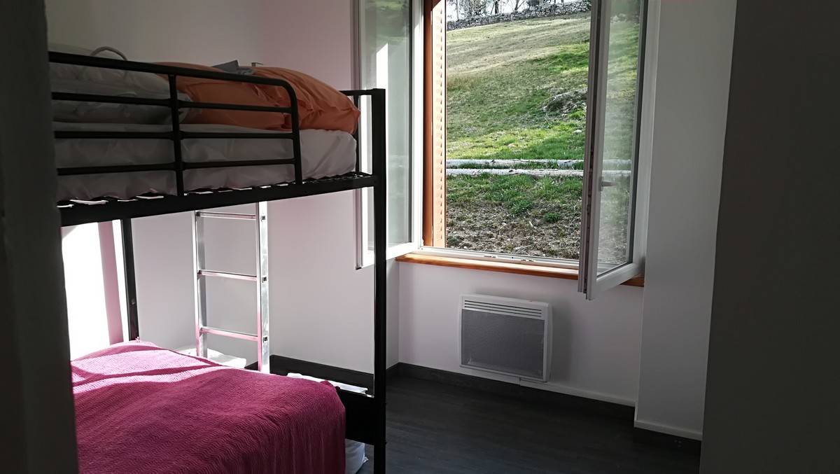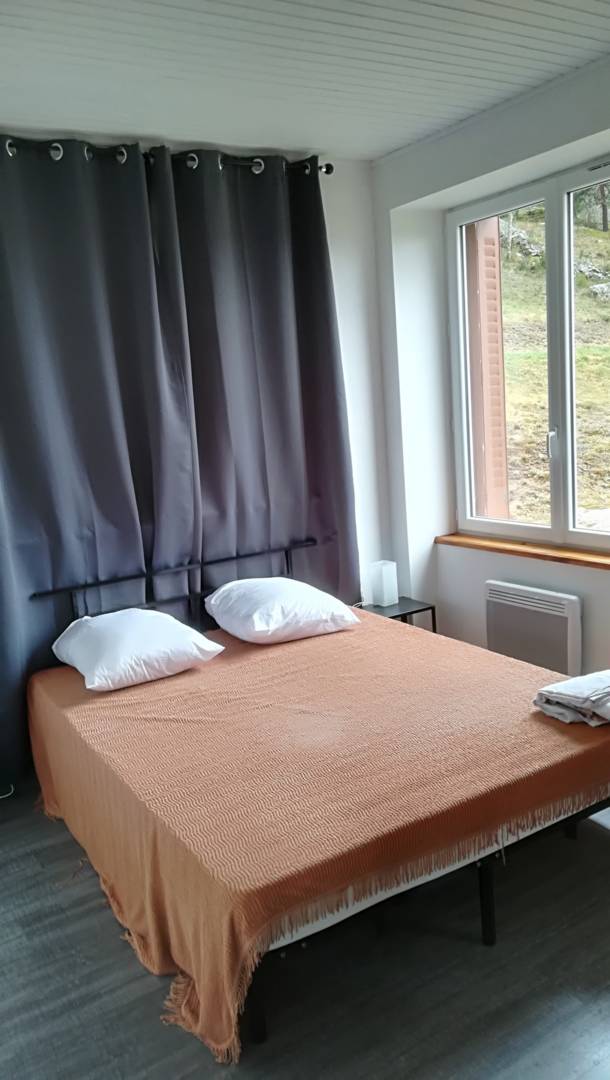 Le gîte est sur un terrain en surplomb de la voirie permettant la vue panoramique et la tranquillité. C’est une maison en pierre à deux niveaux accessibles par un escalier intérieur et un escalier extérieur. Le rez de chaussé est composé d’un garage pour voiture et autre (vélo, moto ..) et d’une buanderie avec évier, cuisinière à gaz, lave linge, table de cuisine. A l’étage nous avons une grande pièce de vie qui comprend une cuisine équipée, un frigo avec congélateur, un four de cuisson(élec), un micro-ondes , évier, plan de travail avec plaque de cuisson 4 feux à gaz, une table 6 à 8 places pour la restauration, un canapé convertible ,une table de salon et télévision. Le couloir nous amène sur la première chambre équipée avec un lit de 160 et une armoire de rangement, salle de bain avec un meuble vasque, douche et toilettes (avec ventilation) et sèche serviette. La deuxième chambre est équipée d’un lit superposé (2×140 ) et d’un placard de rangement.