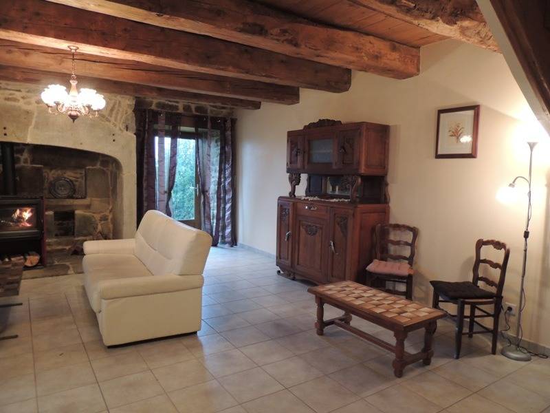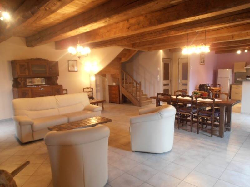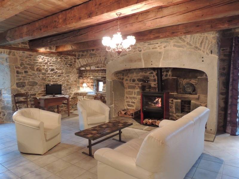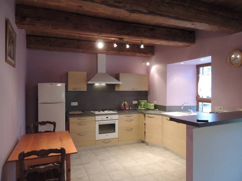 Au rez-de-chaussée : 1 cuisine ouverte (entièrement équipée) sur une salle à manger salon et cheminée (poêle à bois).