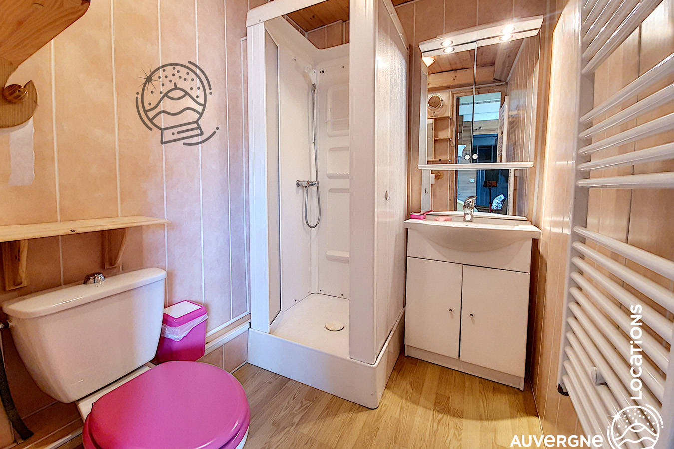 Cet hébergement se compose à l’étage principal d’une pièce de vie avec coin cuisine, salle à manger et salon tourné face à l’insert de cheminée pour vos soirées d’hiver.