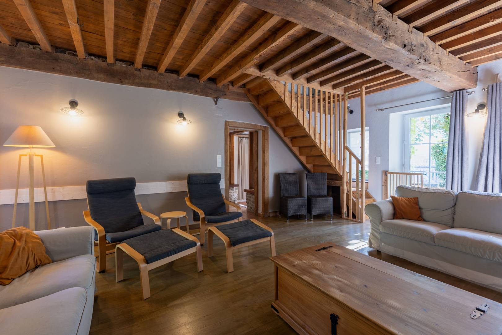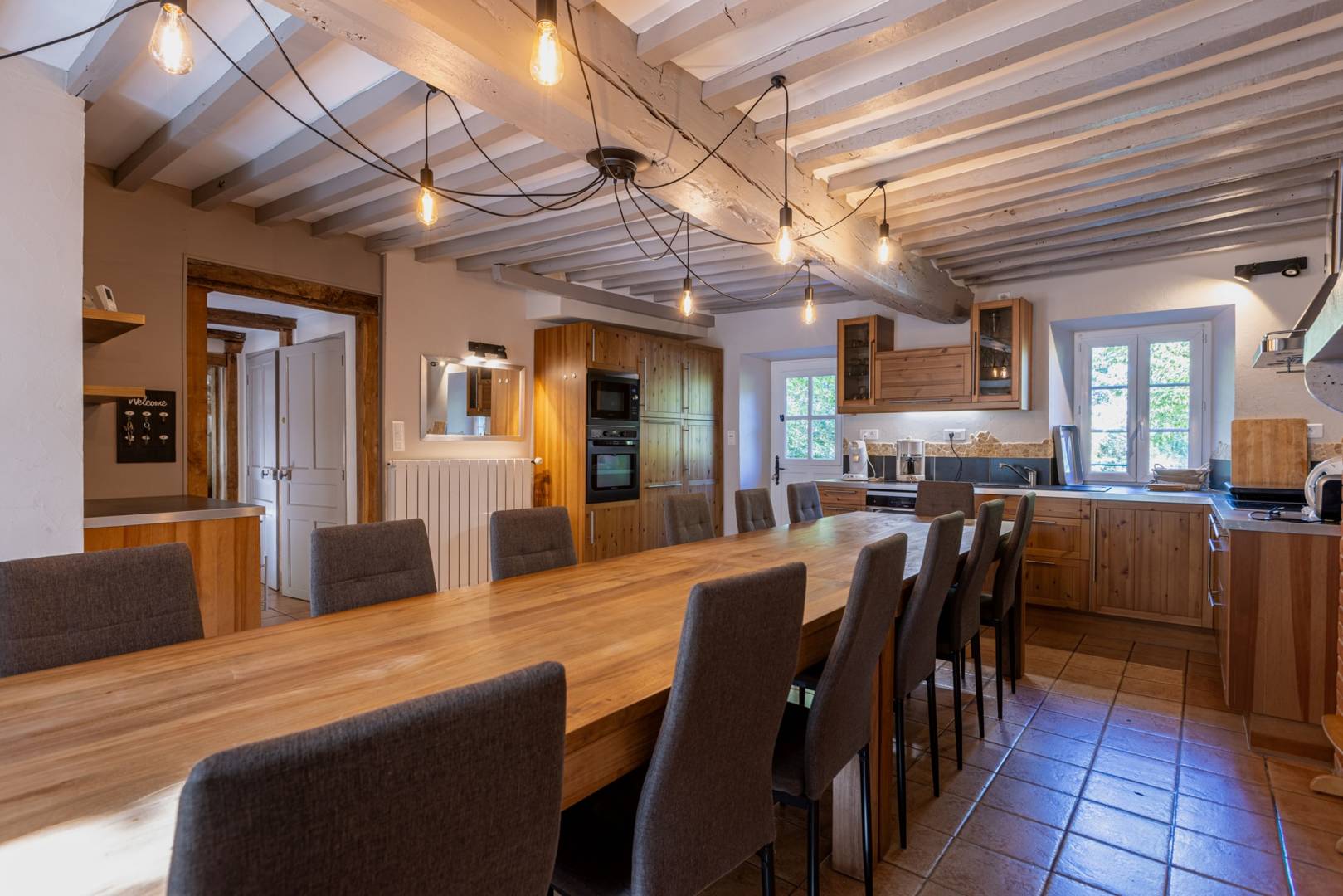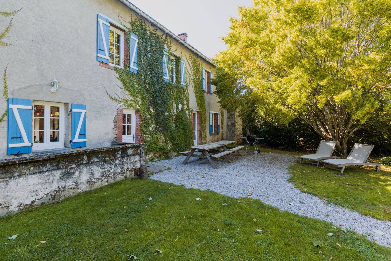 Grande maison comprenant 6 chambres, 3 salles de bain, grand salon avec cantou et poêle à bois, cuisine/salle à manger équipée pour 15 personnes, jardin clôturé et arboré de 3000 m² avec piscine (chauffée en été), aire de jeux, bbq, terrasse et transats.