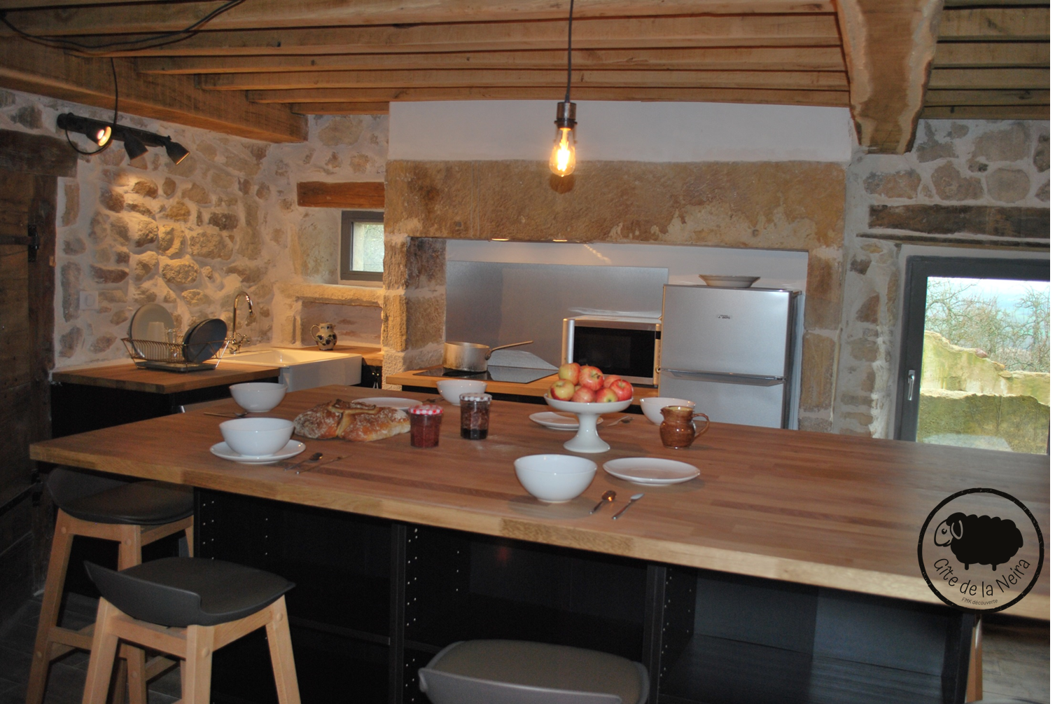 A la fenêtre du château de Ravel, cette maison paysanne est entièrement rénovée avec charme et simplicité. Elle met en avant les matériaux de la région : l’arkose (pierre) et le bois.