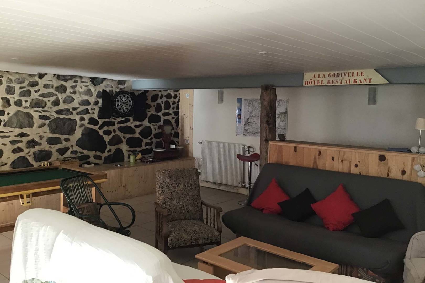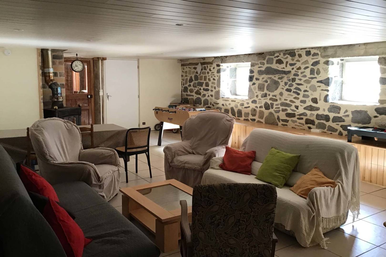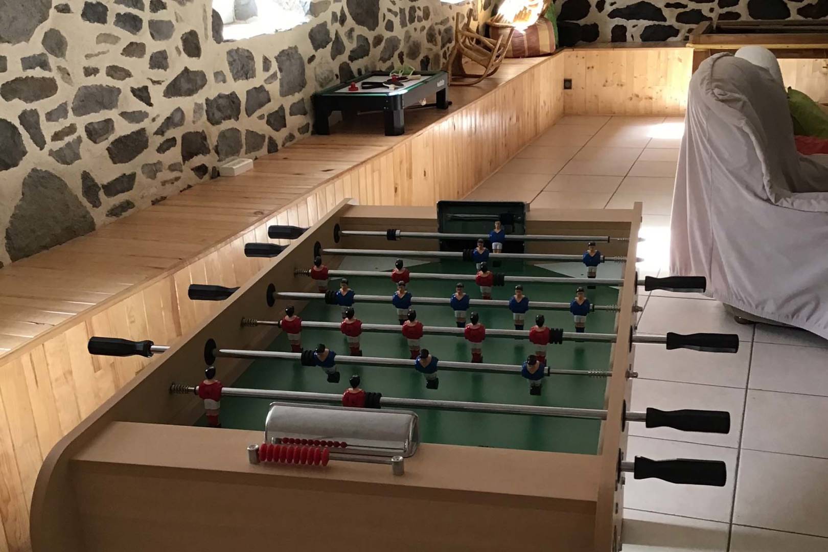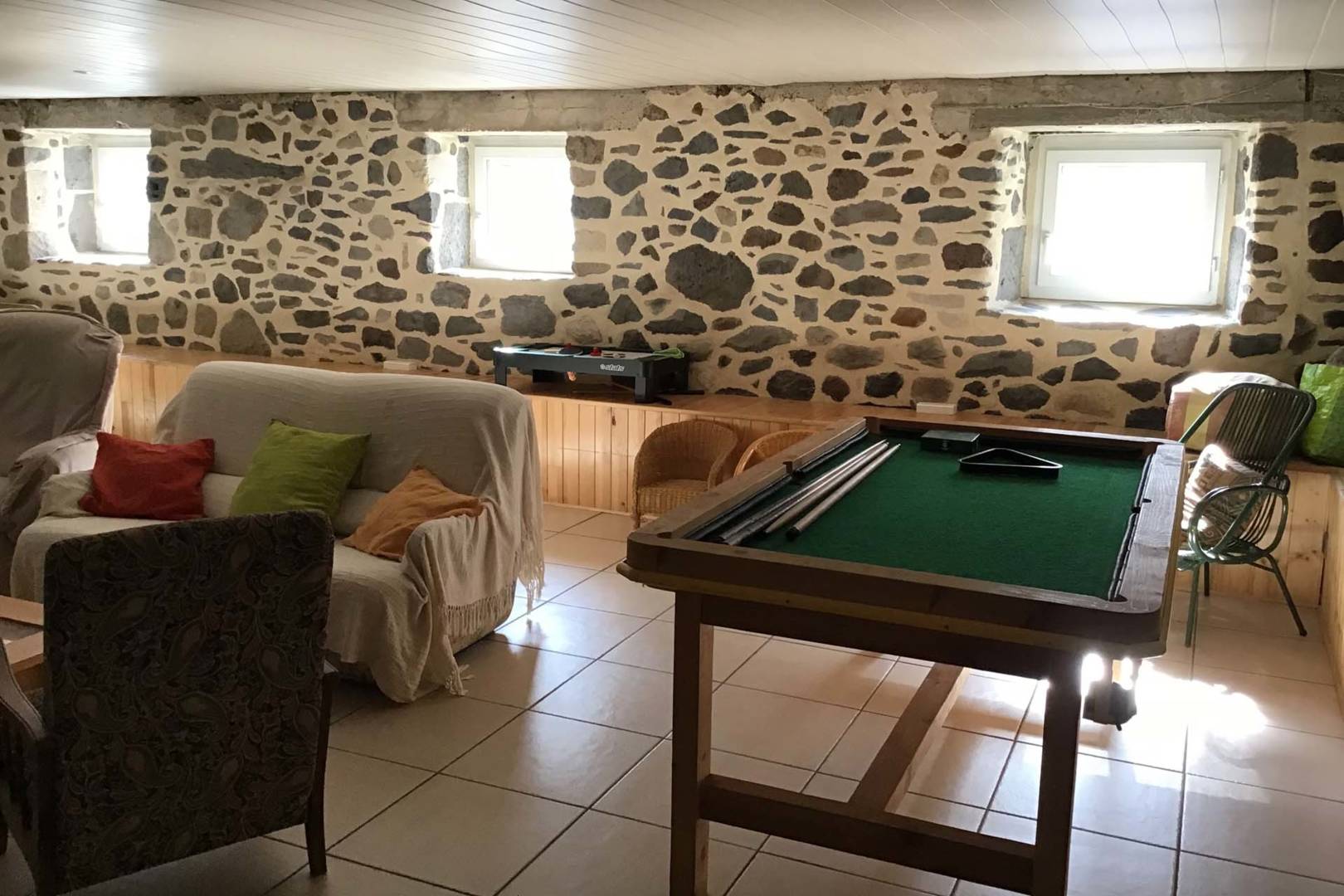 – grande pièce de vie de plus de 60m2, avec un baby-foot, jeu de fléchettes, billard (fabrication artisanale), seconde grande table, …