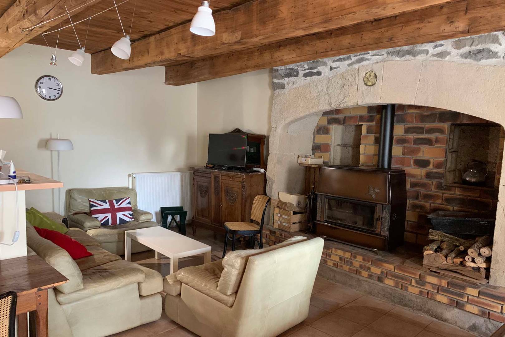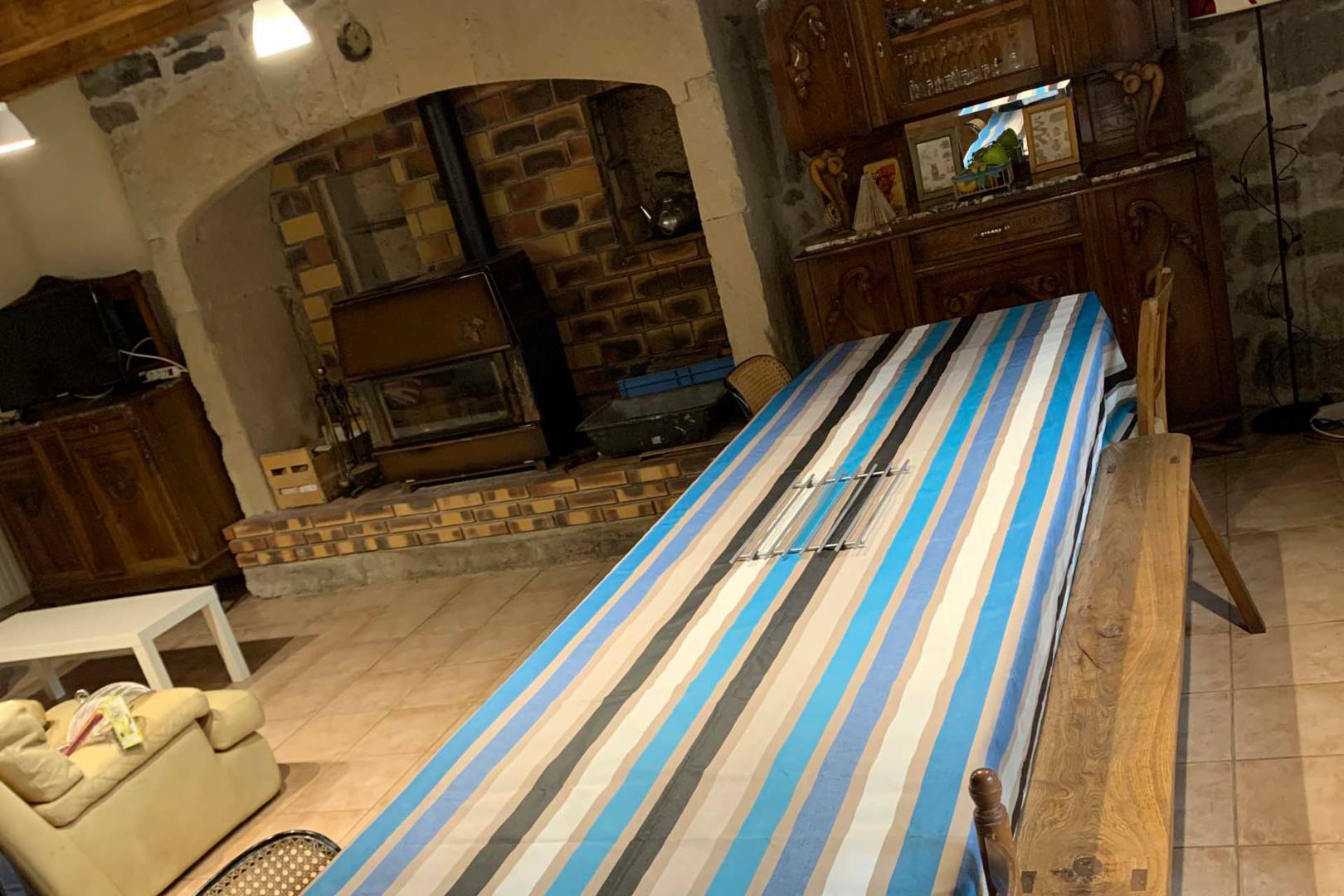 – cuisine ouverte sur la salle à manger/salon de 40m2, grande table avec rallonges pour 15 personnes, poêle à bois