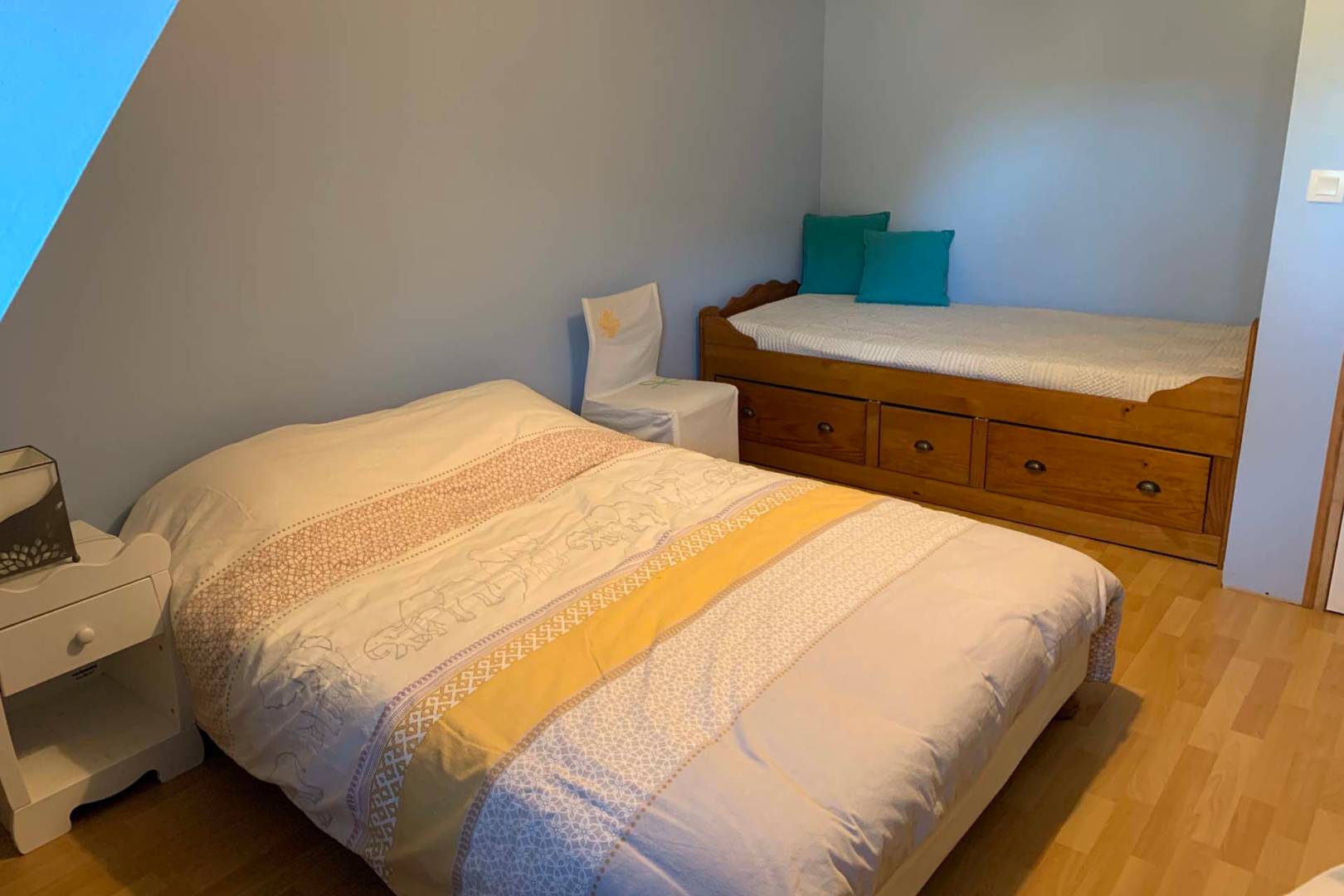 – 3 chambres : la chambre bleue avec un lit double et un lit simple, la chambre rose avec un lit double et un lit simple, la chambre jaune avec un lit double