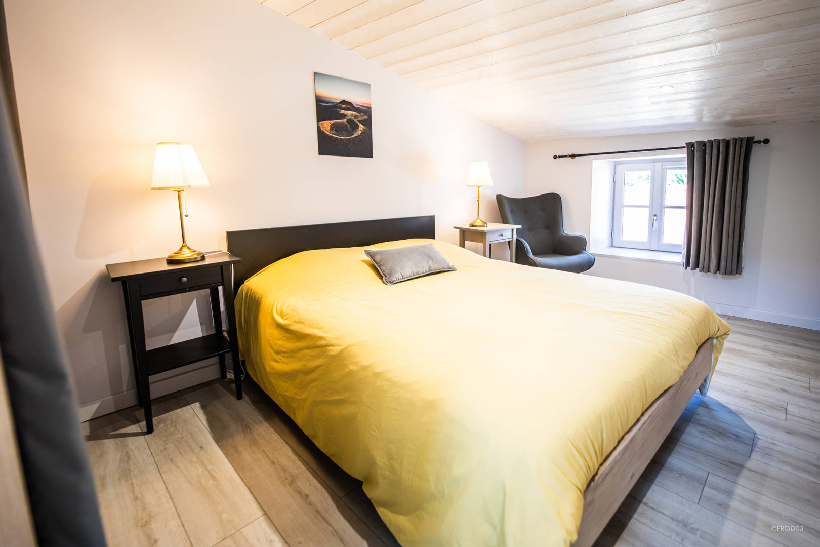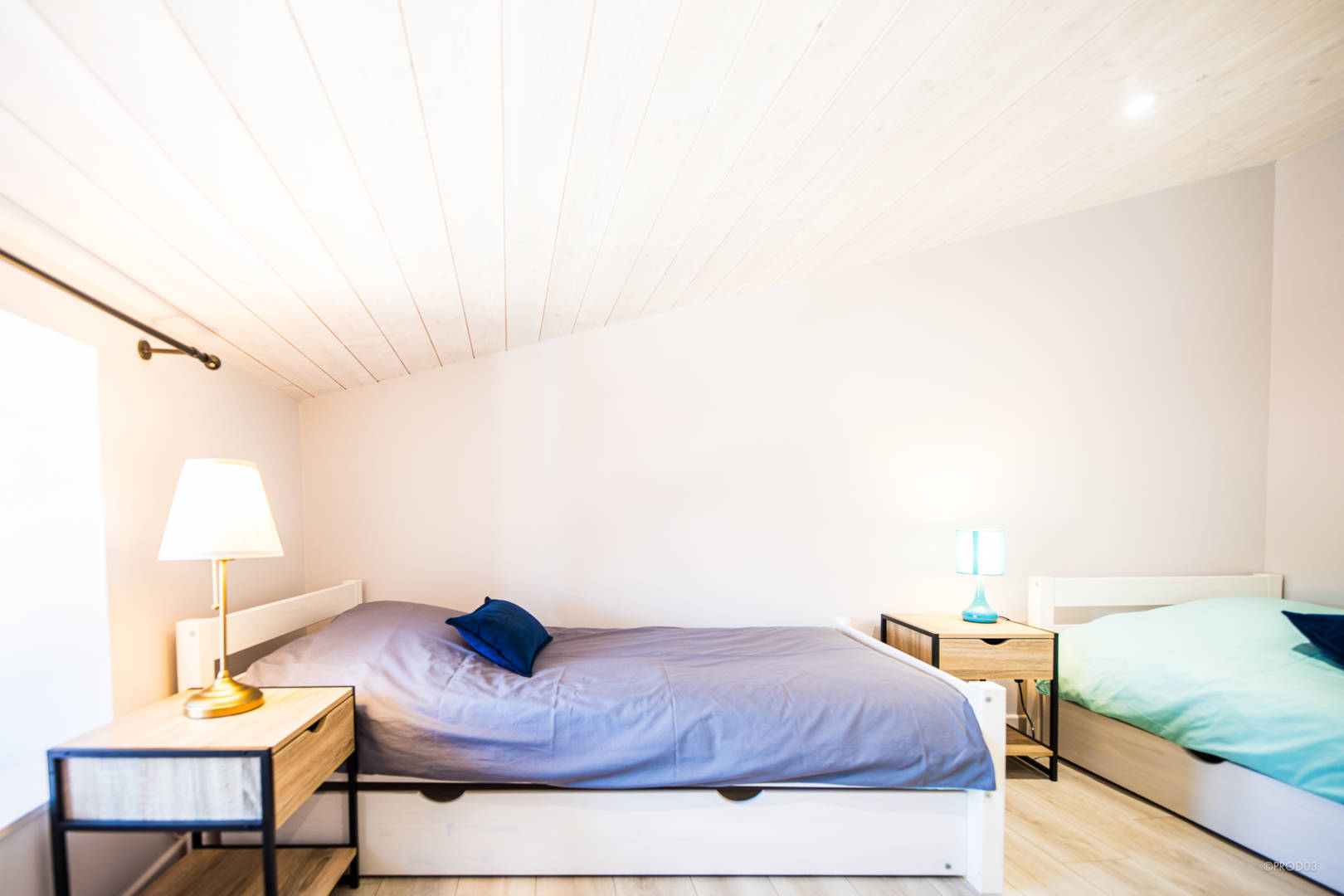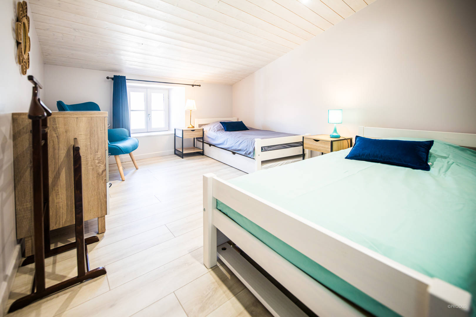 À l’étage vous trouverez deux chambres, salle de bain et un wc séparé, vous aurez accès à un jardin que vous partagerez avec les propriétaires.