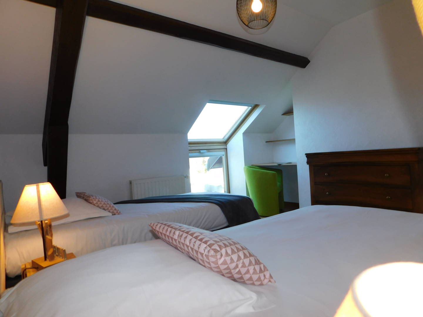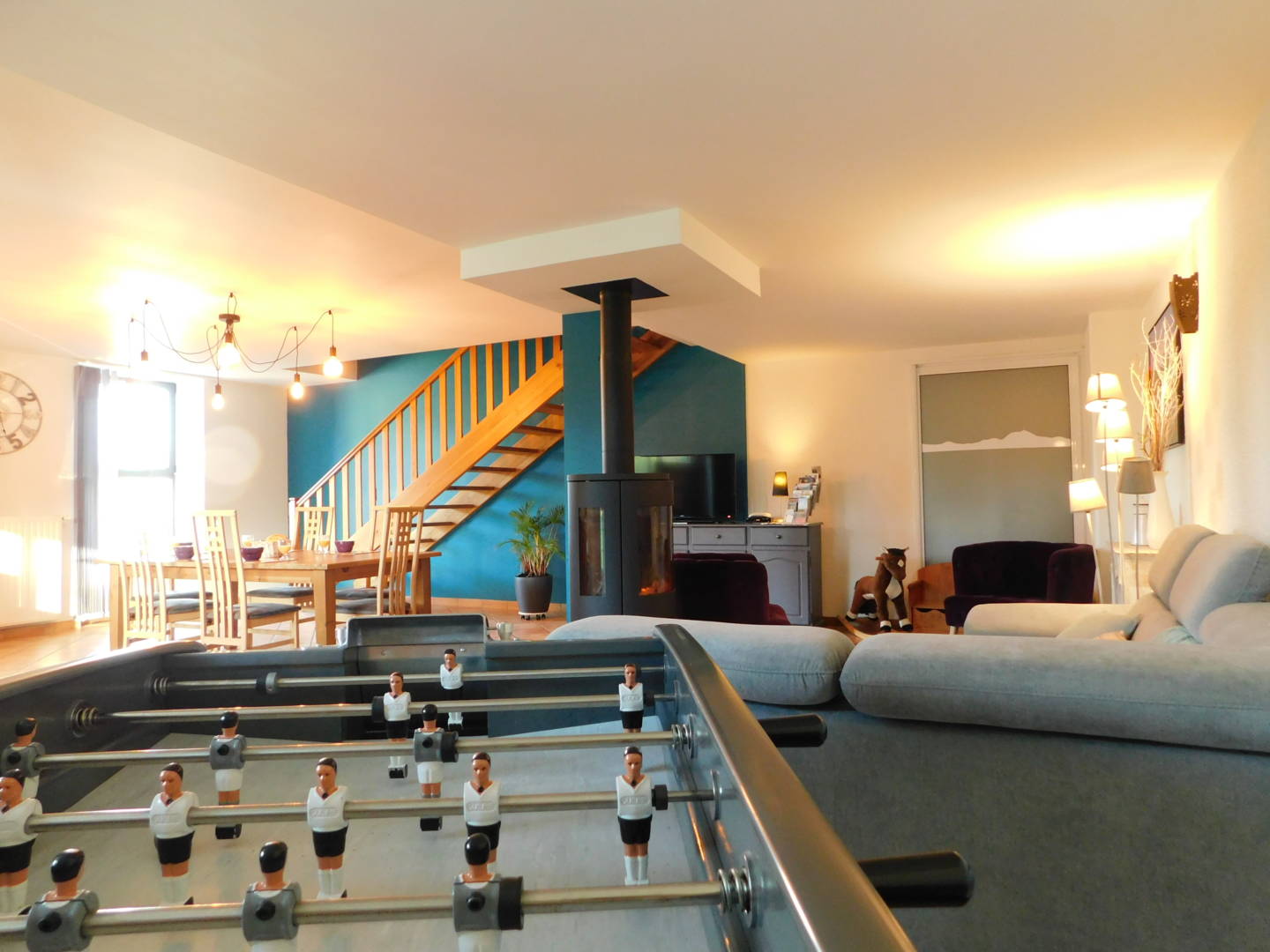Vous profiterez d’une grande pièce à vivre lumineuse et fonctionnelle avec une cuisine toute équipée donnant sur un espace repas salon avec jeux baby-foot, d’un poêle à bois pour partager des moments conviviaux.