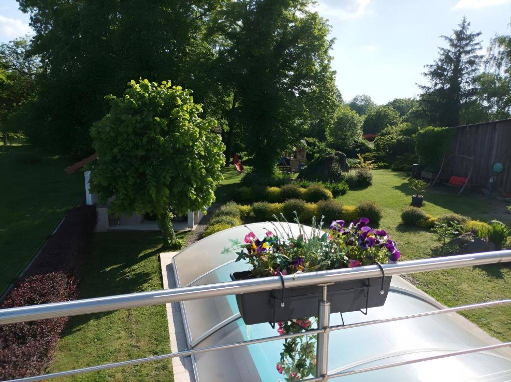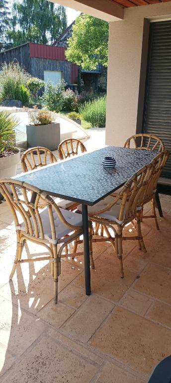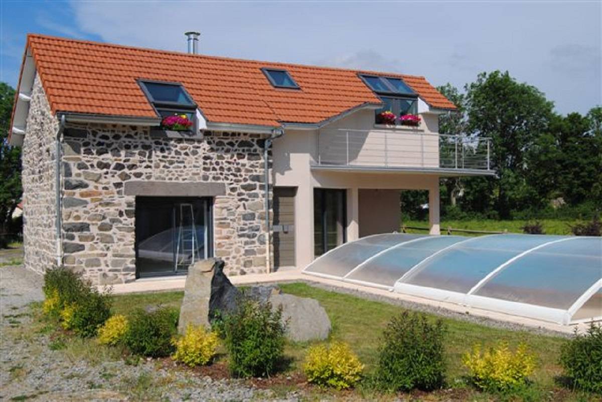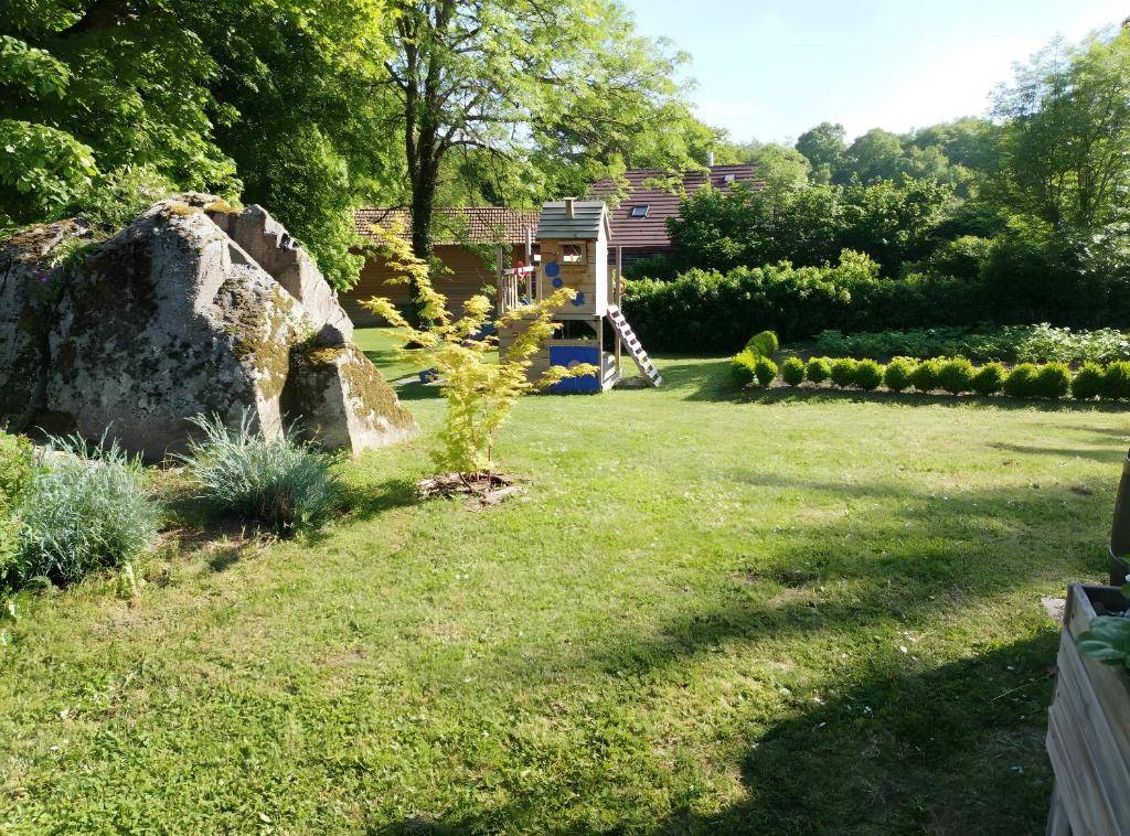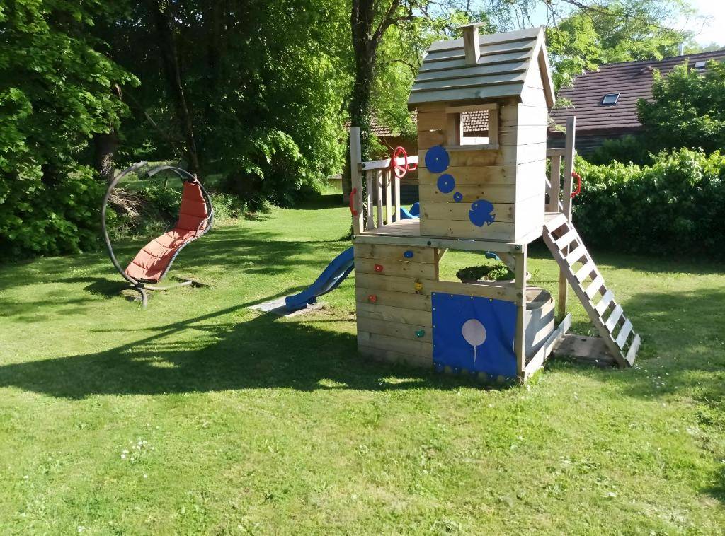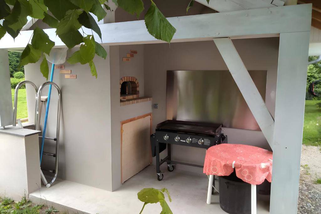 Aménagement extérieur indépendant avec piscine sous abris sécurisée, terrasse couverte pour repas extérieurs avec dépendance équipée de plancha gaz et four à pizza, dans un cadre arboré et fleuri. Parc avec balancelle et jeux pour enfants.