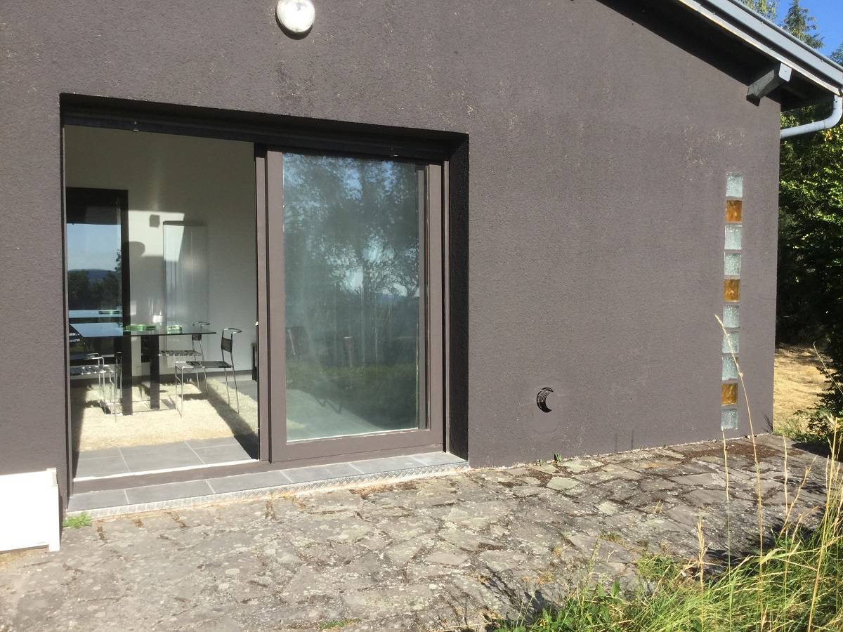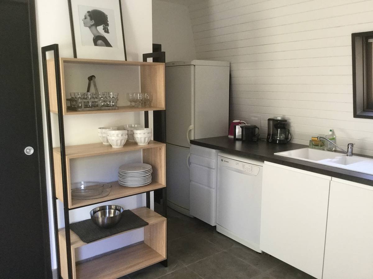 Terrasse avec vue sur le gour avec une plancha électrique et du mobilier de jardin. Le prix de la location comprend le linge et le ménage.