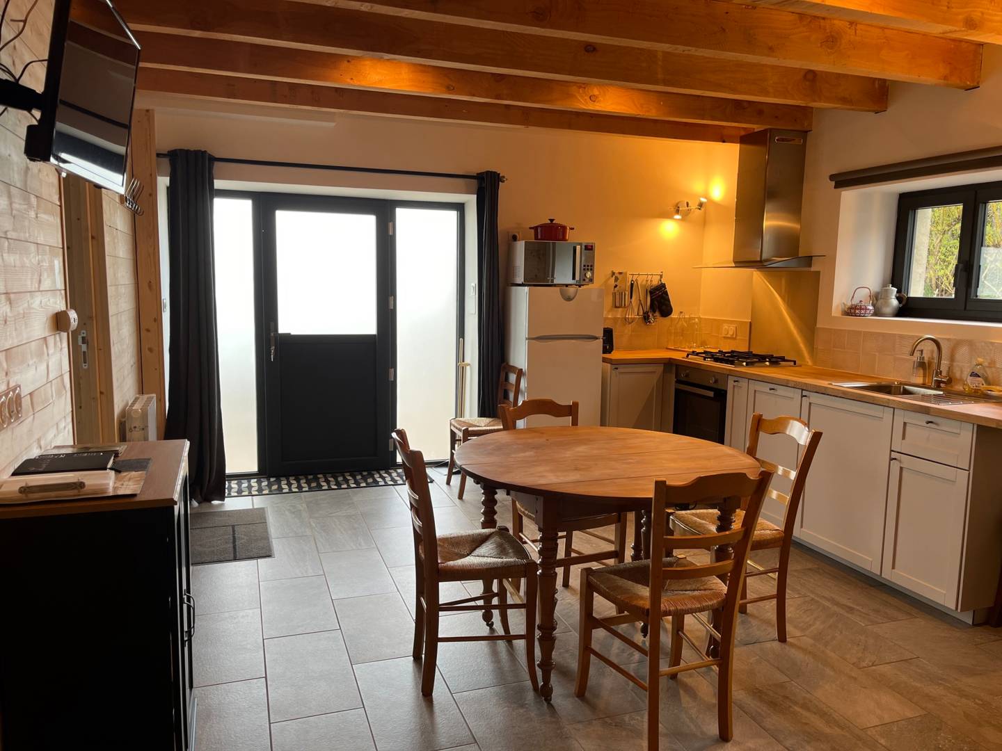 Une pièce de vie est également comprise avec cuisine équipée, canapé, table à manger.