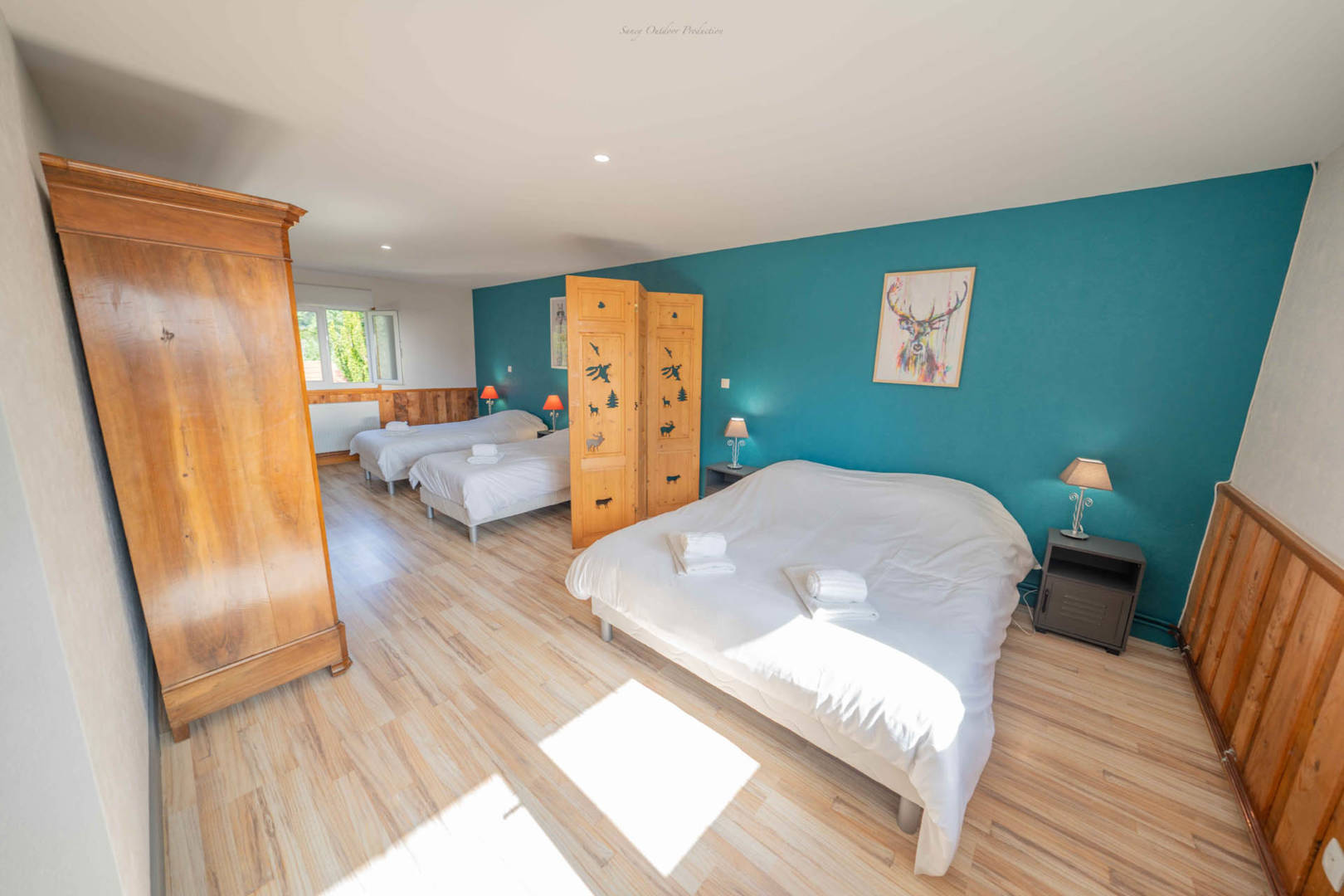 • Chambre 3 traversante : 1 lit 160 cm, 2 lits 90 cm, couettes et oreillers, une armoire, une salle de bain avec douche et lavabo, un WC séparé
