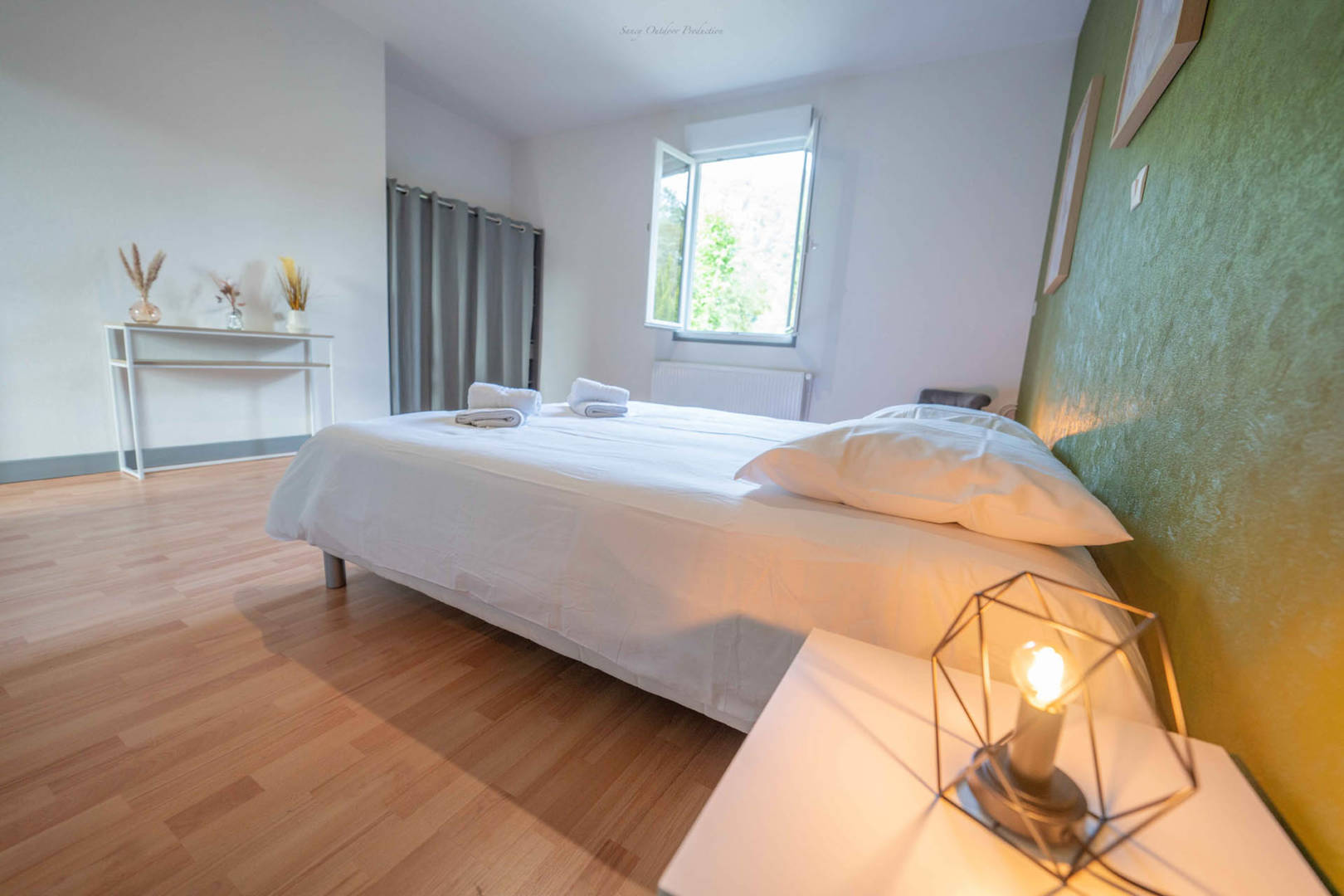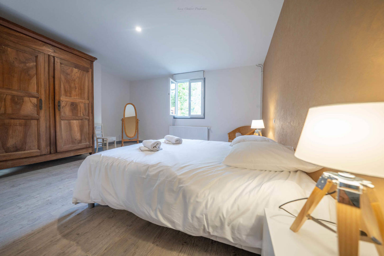 • Chambre 2 : 1 lit 160 cm avec couette et oreillers, un dressing, une salle de bain avec douche et lavabo, un WC séparé