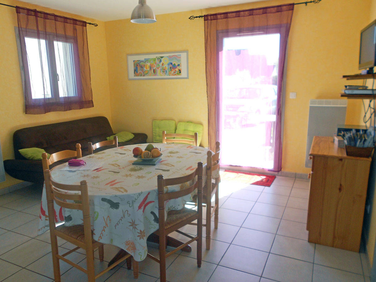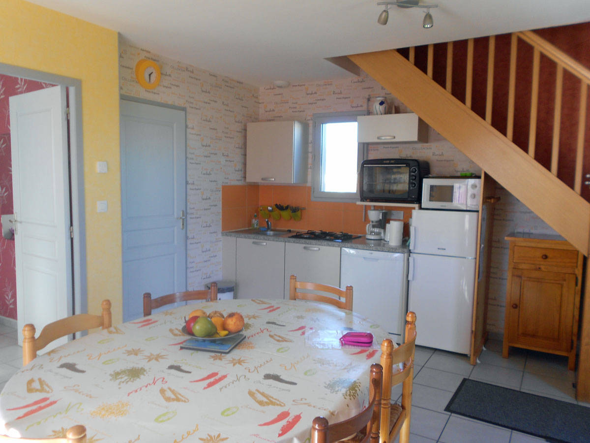 Rez-de-chaussée : Salle de séjour avec coin cuisine et coin salon ouvrant sur la terrasse plein Sud. 1 grande chambre (1 lit 140), une vaste salle d’eau. Etage : 1 grande chambre (1 lit 140), 1 chambre (2 lits 90), 1 WC. Matériel bébé. Chauffage électrique compris juillet et août (suppl. au-delà de 10 kW/j autres périodes). Animaux acceptés.