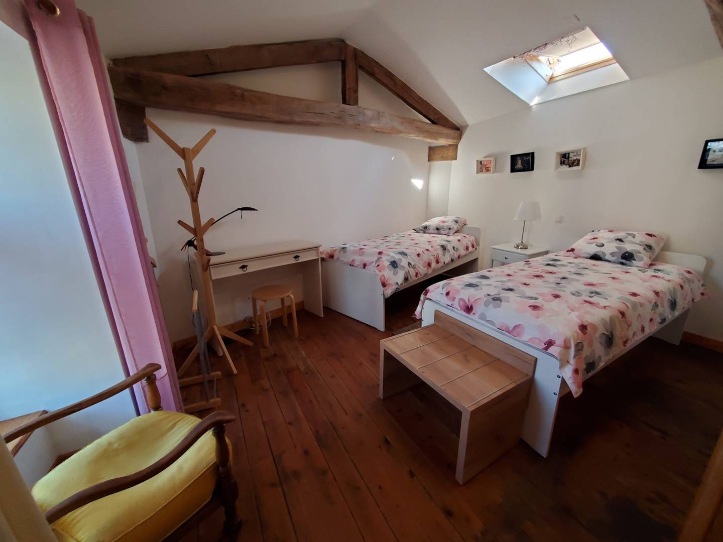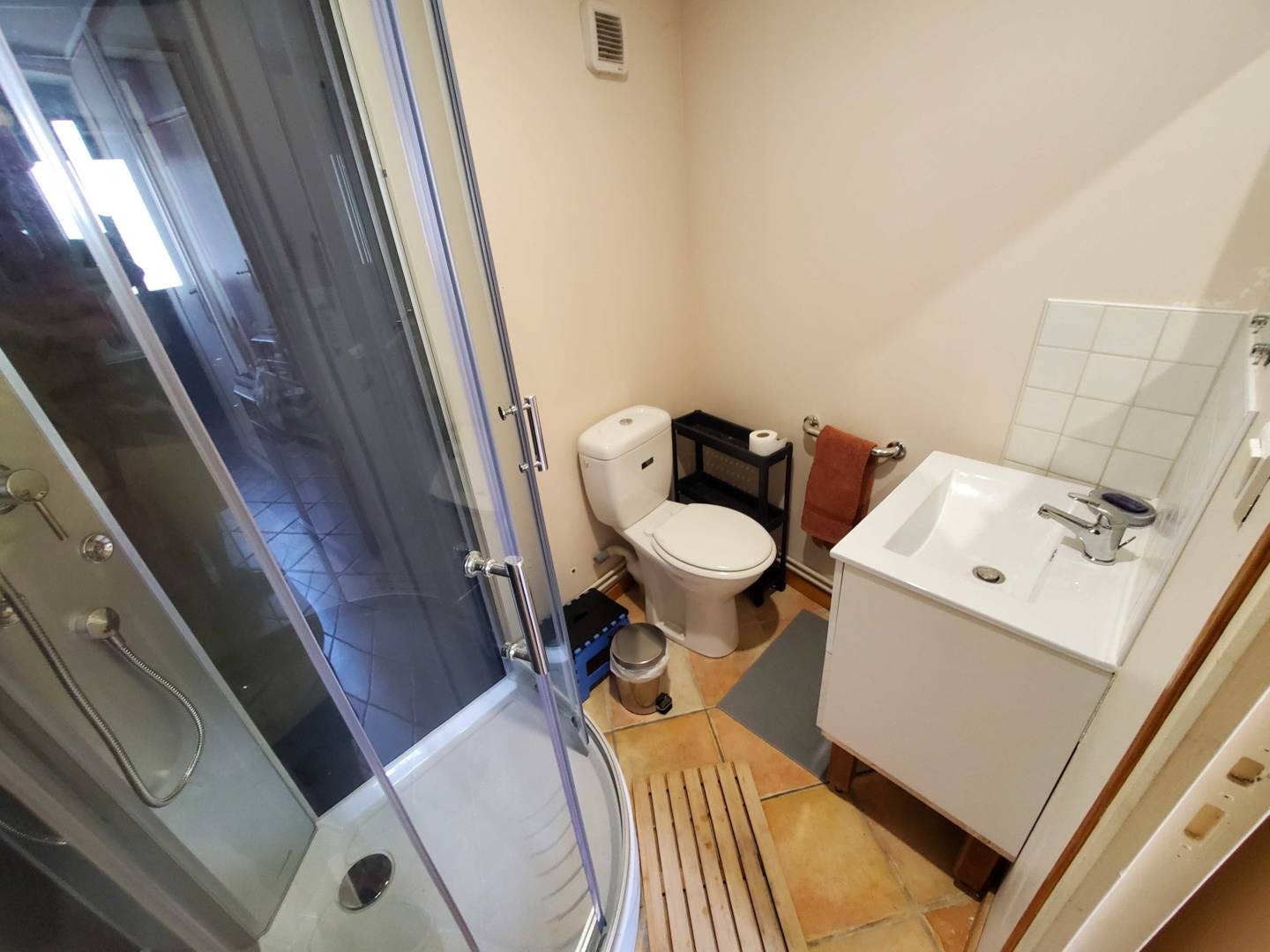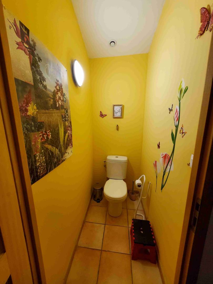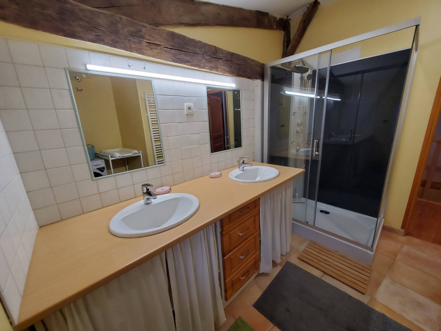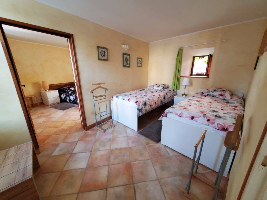 En arrivant vous pourrez déposer chaussures et manteaux avant d’accéder aux chambres et à l’étage. Au rez-de-chaussée se trouvent deux chambres : l’une avec un lit de 160, l’autre avec deux lits de 90. Une salle de douche avec lavabo, et toilette est attenante. Carrelage sur tout ce niveau.