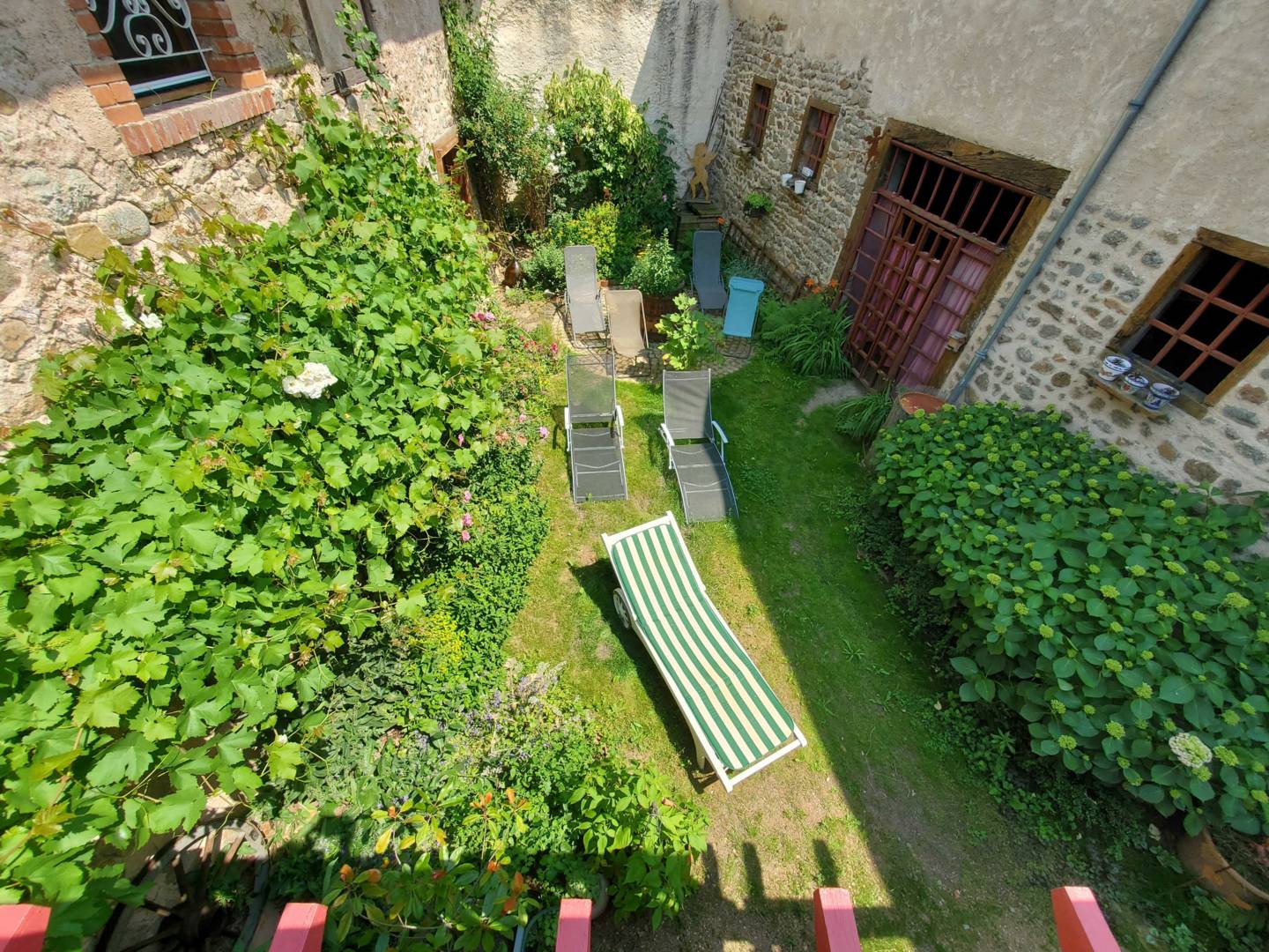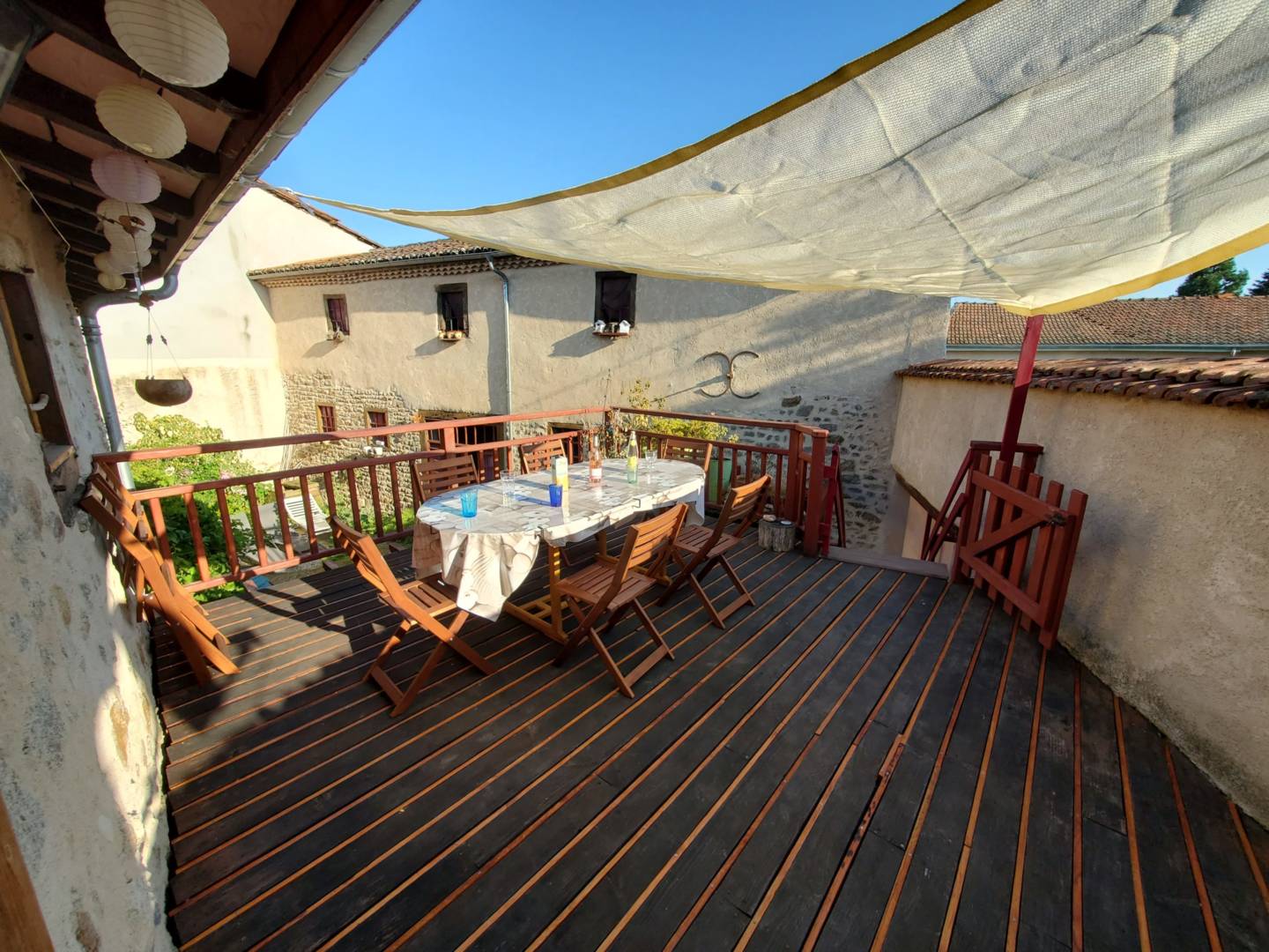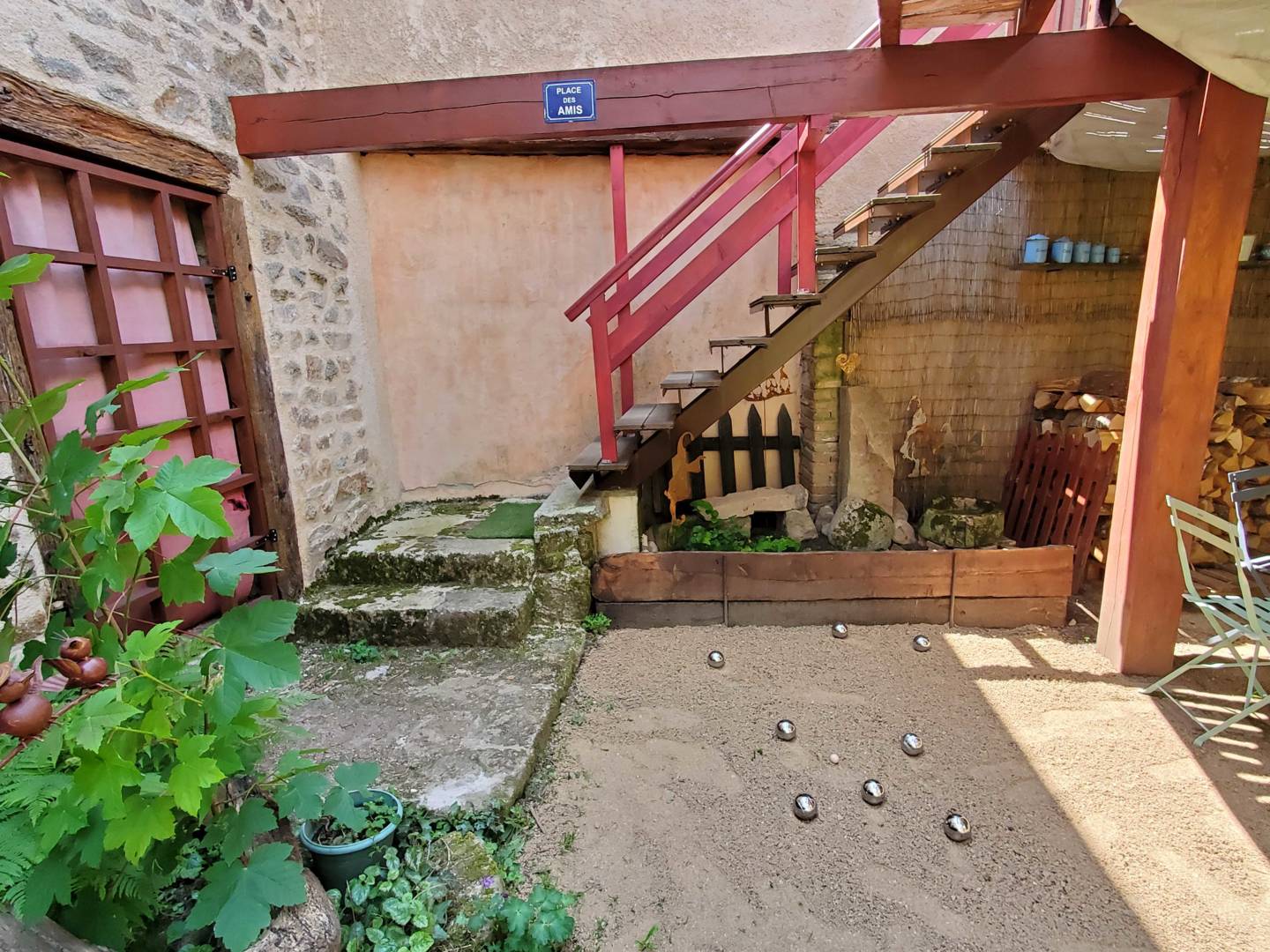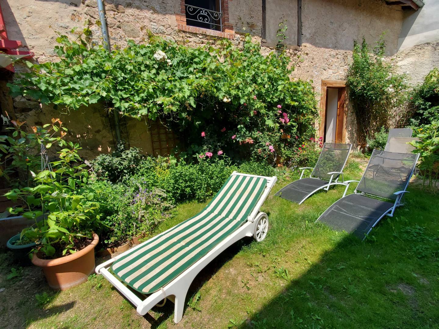 Une porte fenêtre de la cuisine donne accès sur une terrasse en surplomb de la cour intérieure privée. Cette terrasse au soleil, protégée par des parasols, offre une vue sur la cour fleurie de géraniums, rosiers, autres fleurs de saison et vigne. La cour est close par une grange en pierre de taille et pisé, crépis à la chaux dorée. Des bains de soleil sont à disposition sur le gazon. Une terrasse à l’ombre se trouve sous la première terrasse, avec une petite piste de pétanque et jeux de fléchettes, pour le moment de l’apéritif, ou autre.