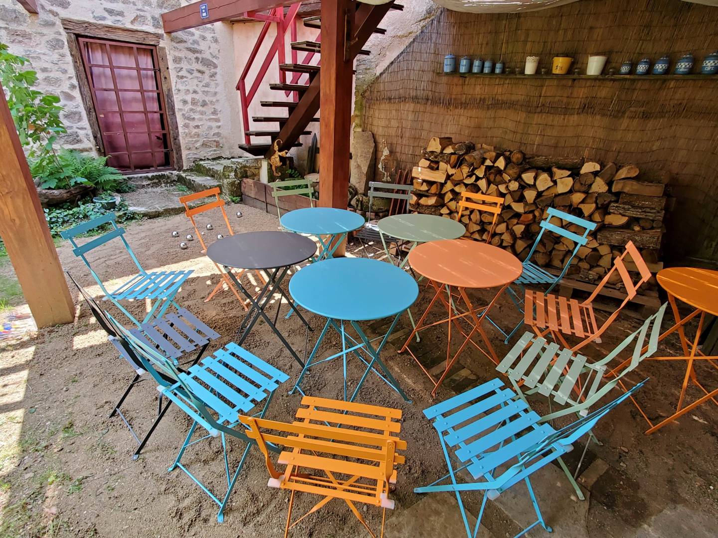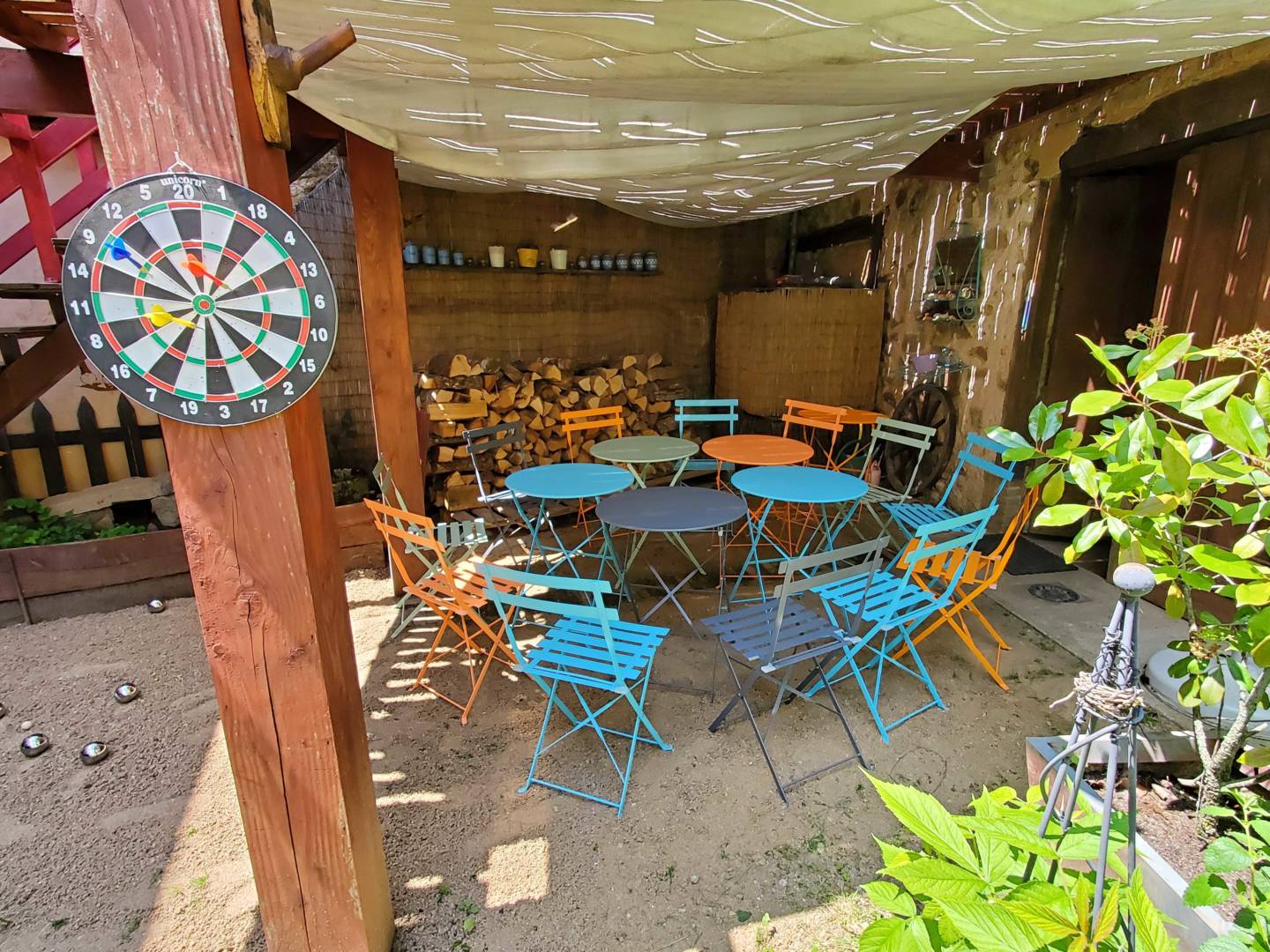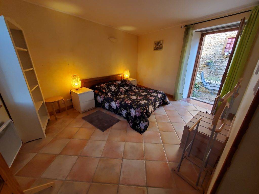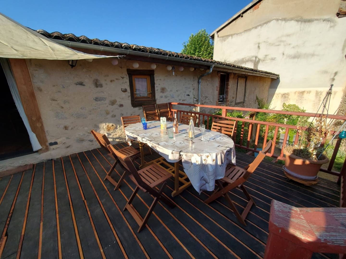 Une porte fenêtre de la cuisine donne accès sur une terrasse en surplomb de la cour intérieure privée. Cette terrasse au soleil, protégée par des parasols, offre une vue sur la cour fleurie de géraniums, rosiers, autres fleurs de saison et vigne. La cour est close par une grange en pierre de taille et pisé, crépis à la chaux dorée. Des bains de soleil sont à disposition sur le gazon. Une terrasse à l’ombre se trouve sous la première terrasse, avec une petite piste de pétanque et jeux de fléchettes, pour le moment de l’apéritif, ou autre.