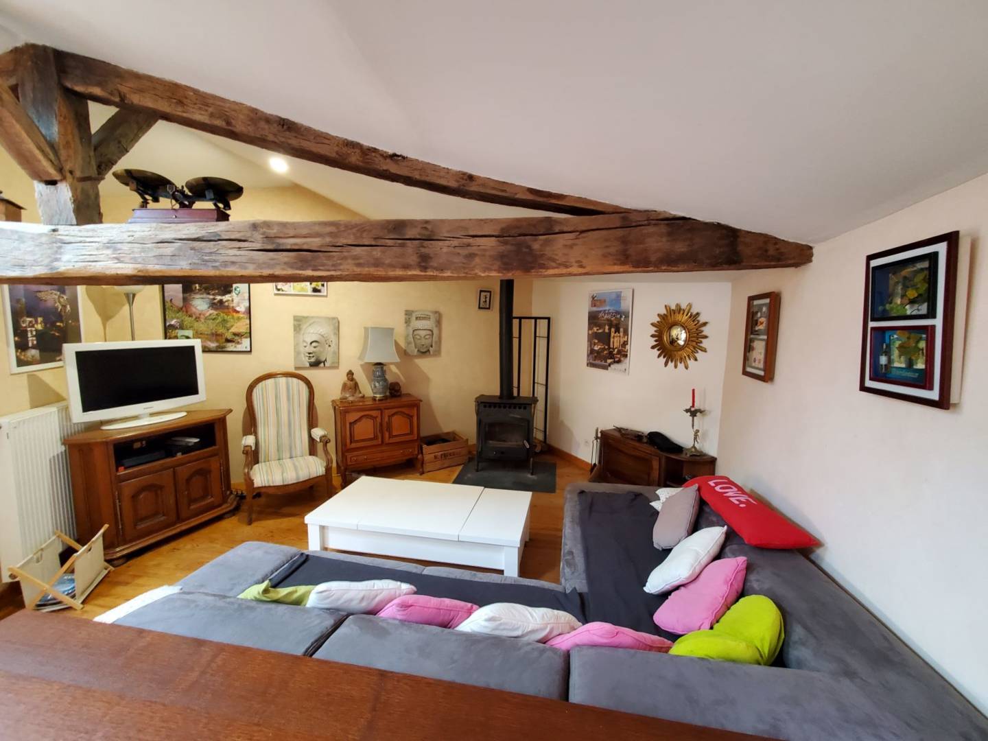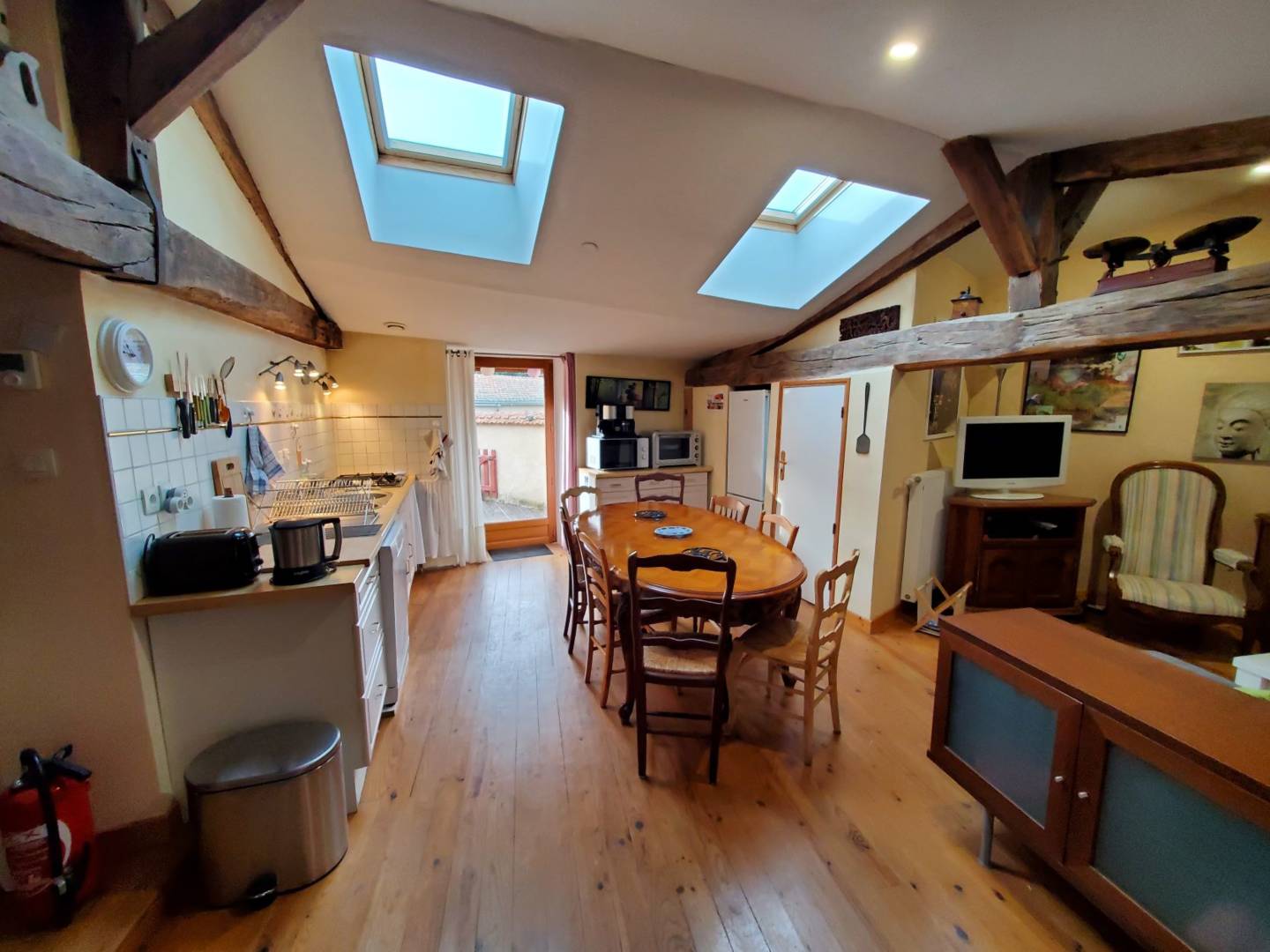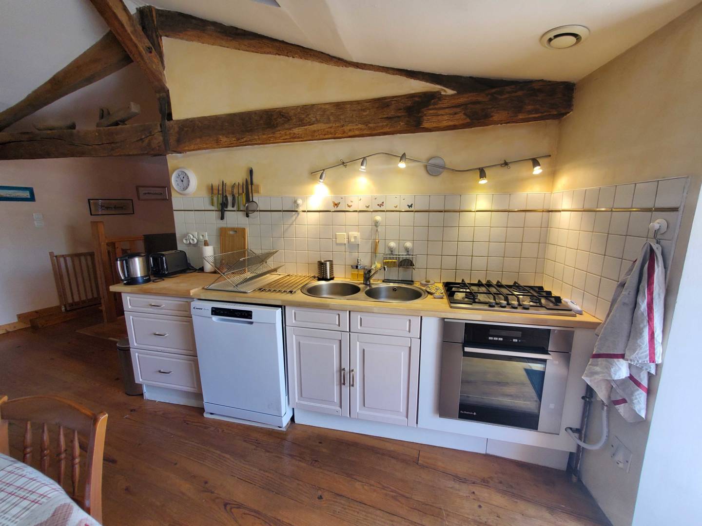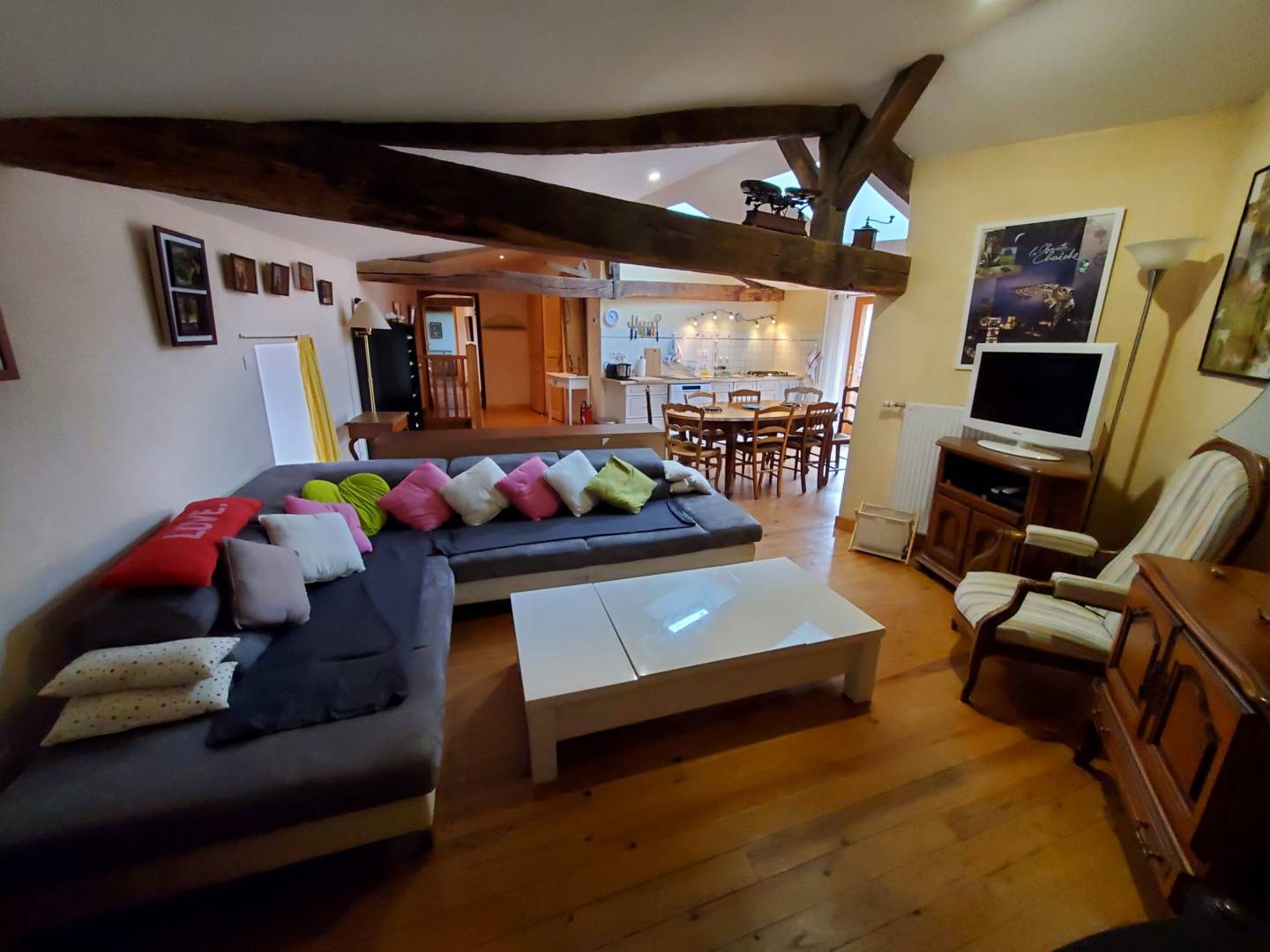 L’escalier en bois donnant accès à l’étage, arrive sur l’espace salle à manger, cuisine ouverte, salon. Cuisine toute équipée, avec un cagibi pour stocker vos victuailles. Grande table en bois d’époque avec son mobilier qui vous rappellera la campagne d’antan.