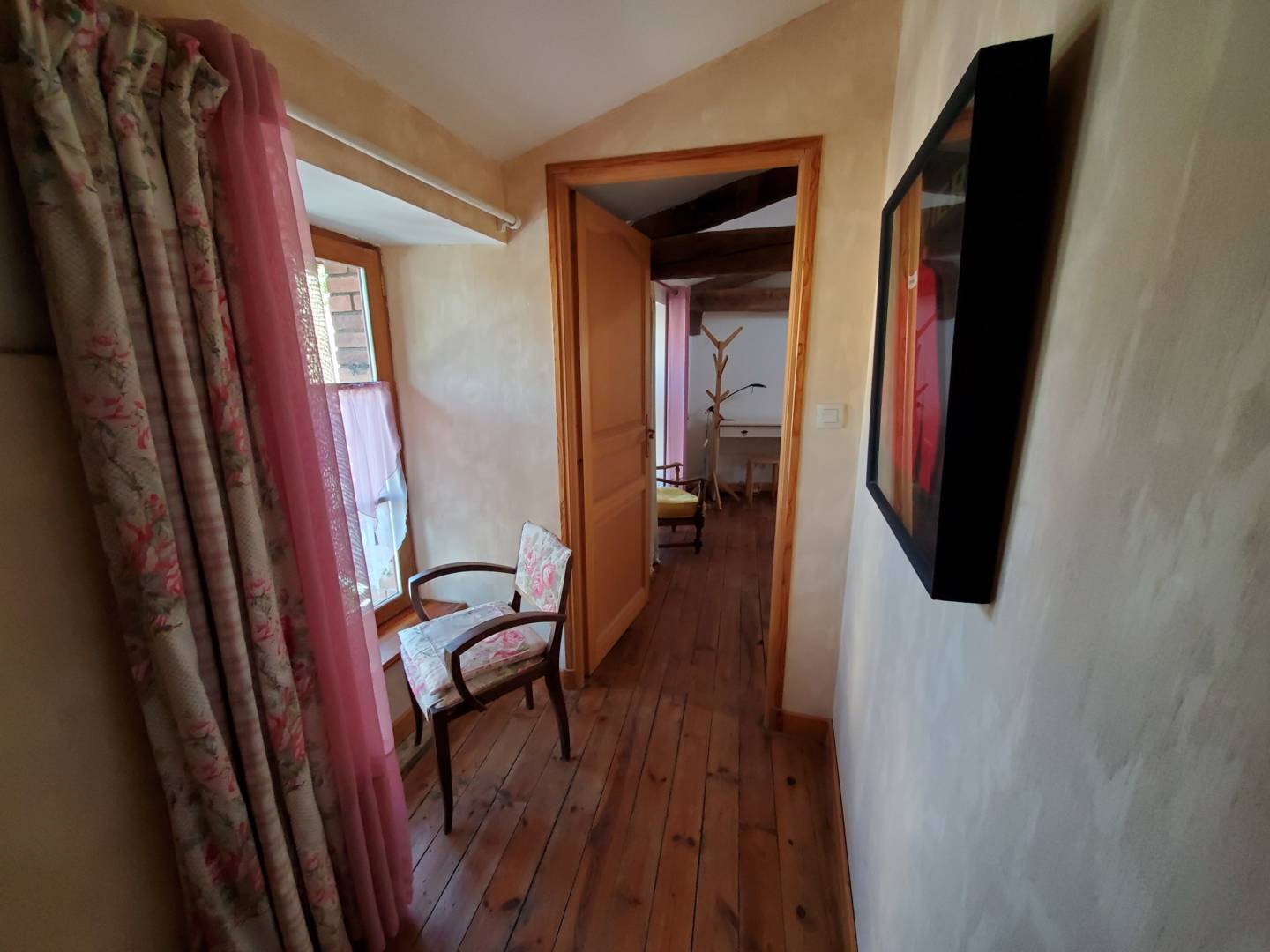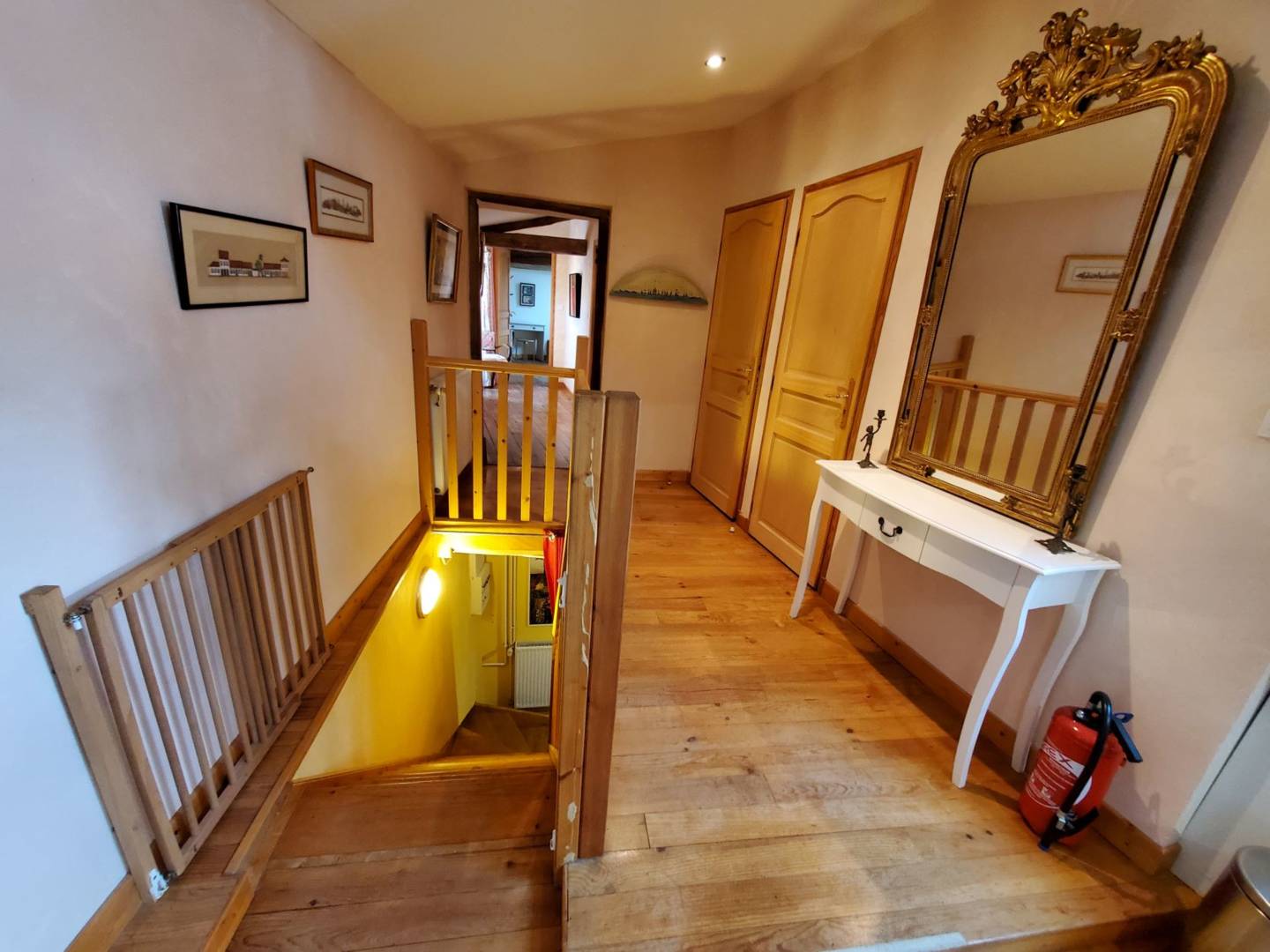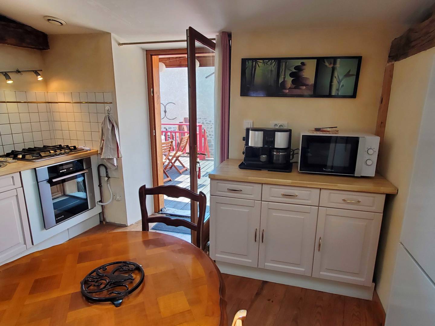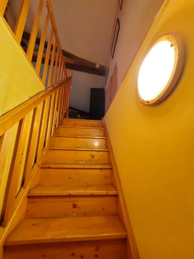 L’escalier en bois donnant accès à l’étage, arrive sur l’espace salle à manger, cuisine ouverte, salon. Cuisine toute équipée, avec un cagibi pour stocker vos victuailles. Grande table en bois d’époque avec son mobilier qui vous rappellera la campagne d’antan.